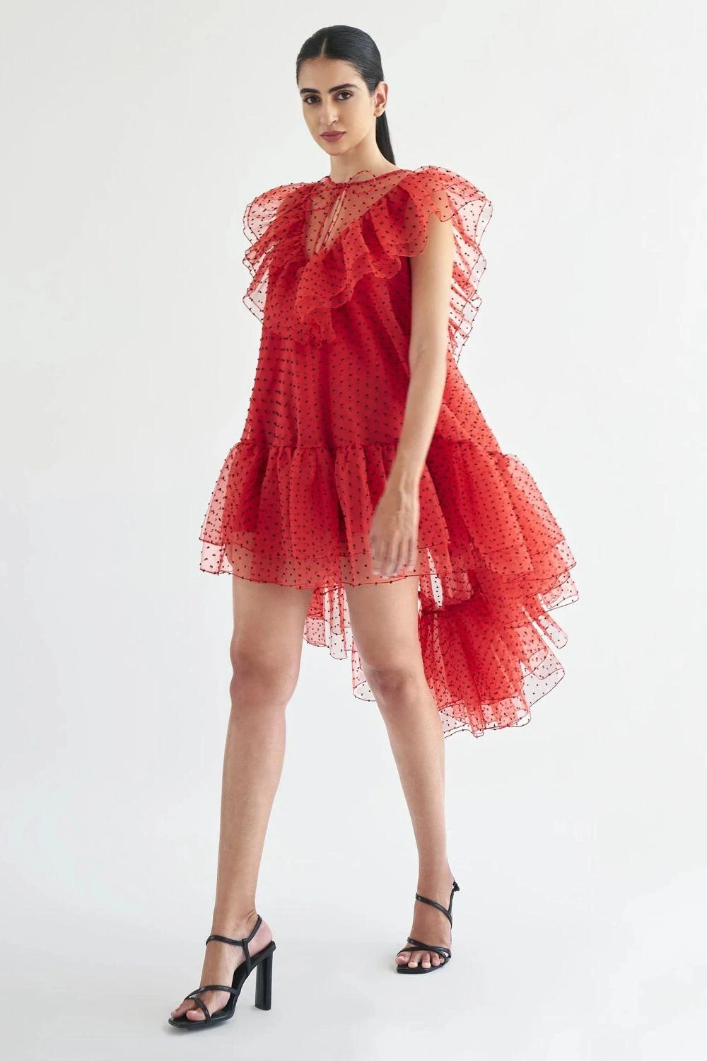 Elevate your style with this Round Neck Tie-Up Trapeze Dress, featuring a high-low hem and exquisite ruffled detailing. This dress combines sophistication with playful elegance for a captivating look.