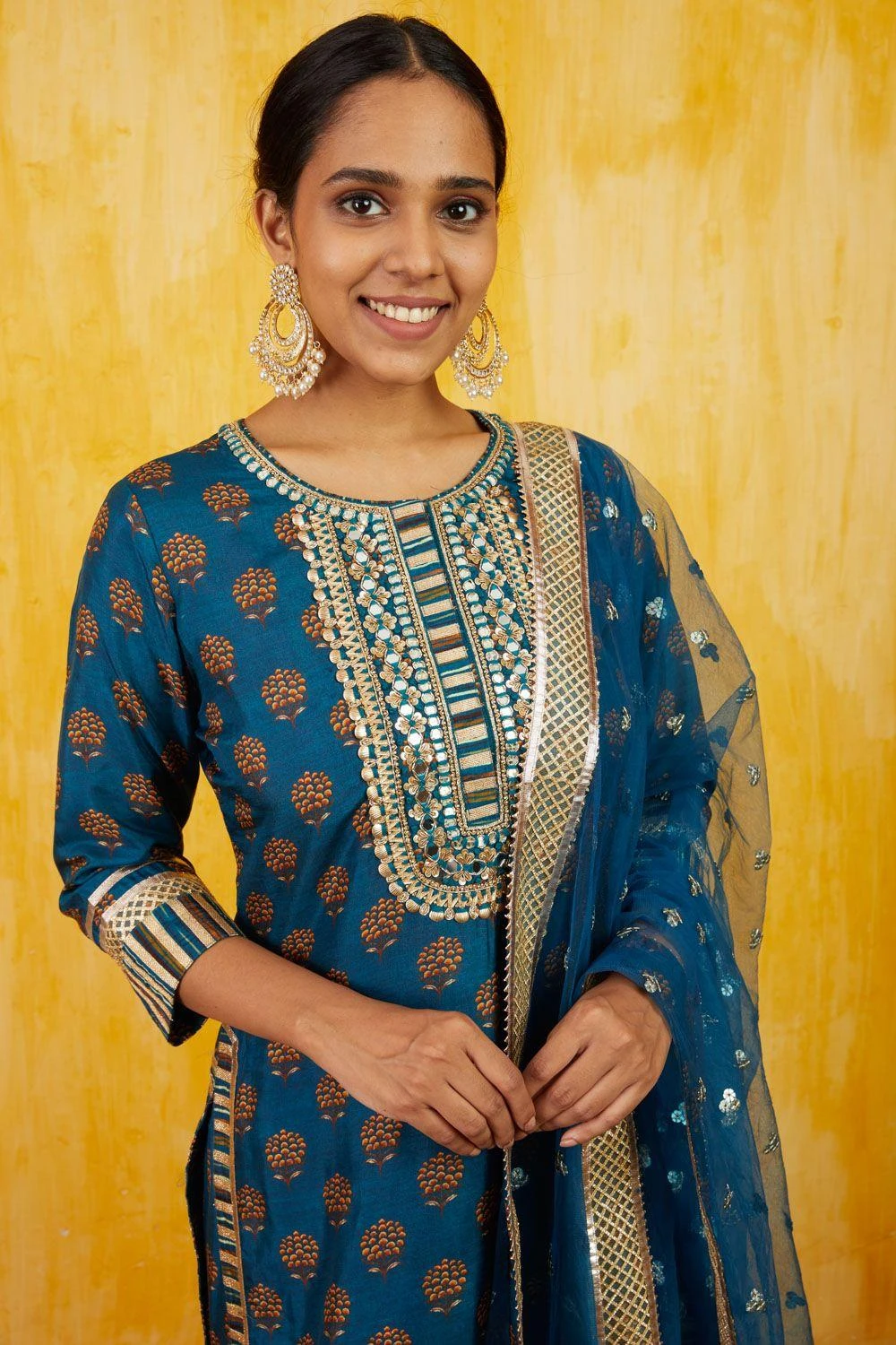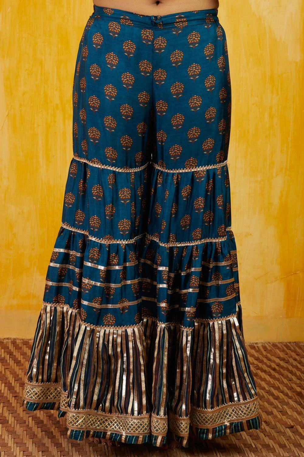 This festive season, amp up your ethnic style with this playful teal sharara set. It features a short length floral printed tussar kurta with gota & threadwork details. It is paired with matching tiered sharara pants and a net dupatta.