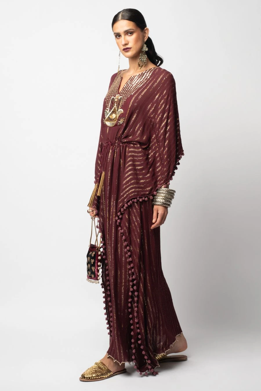 Give your party outfit a fashionable spin with this kaftan. This kaftan cut in lurex georgette features embroidered hamsa motifs and scalloping details at the hem.