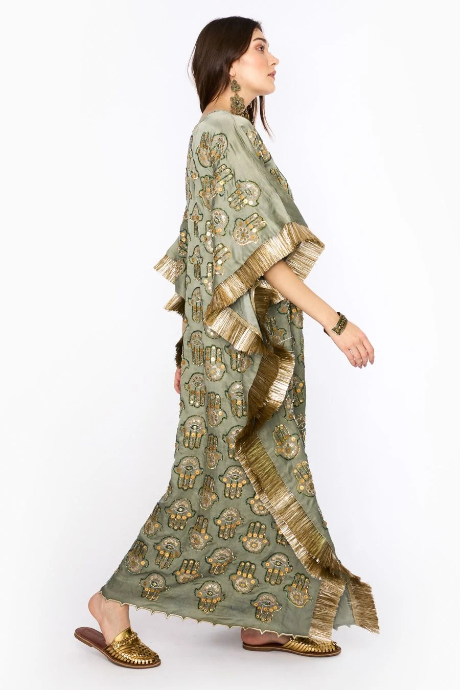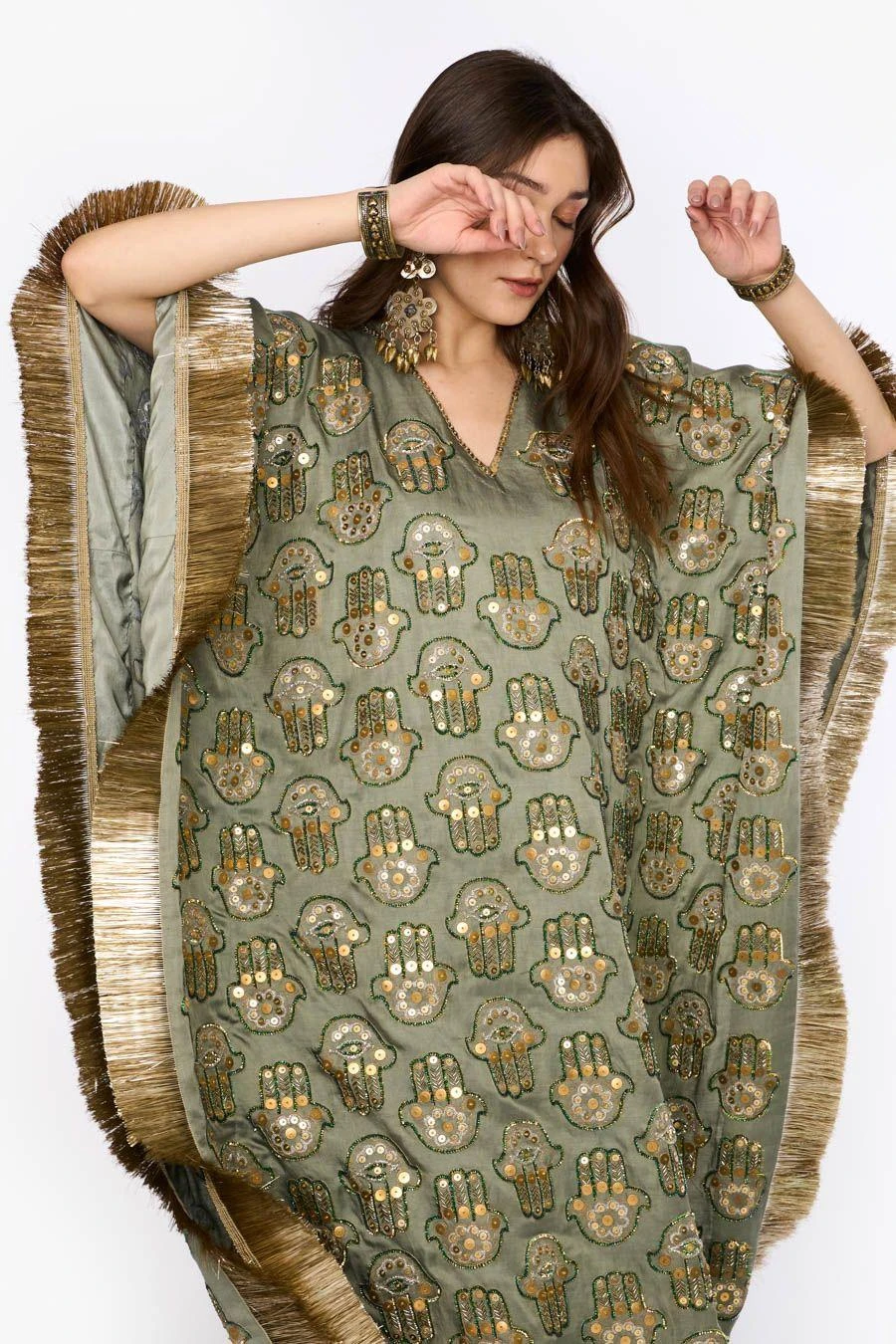 Notch up your evening looks with this easy buoyant banjara kaftan which is both comfortable & stunning. It is made in linen satin and uplifted with exquisitely done hand embroidered hamsa details.