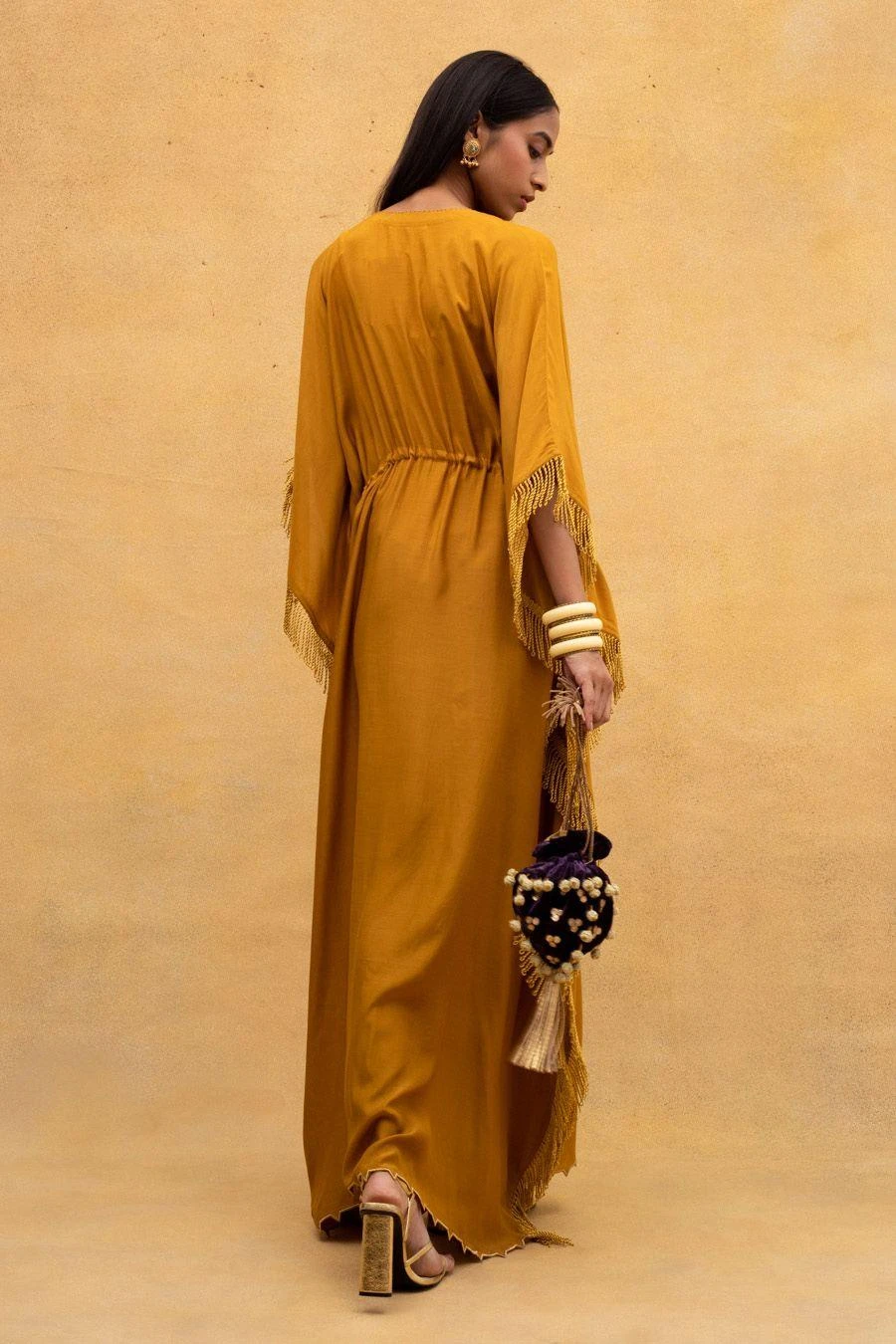This ornate silk kaftan is embroidered with hamsa motifs in dabka & aari work. The piece has gold fringe lace with drawstring details for a cinched waist effect. Style this statement piece for dressy evening events.