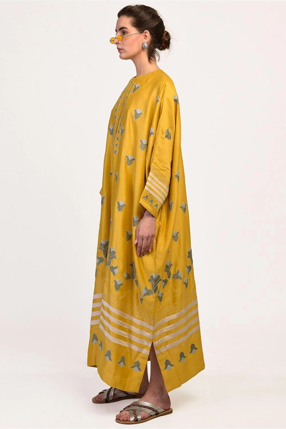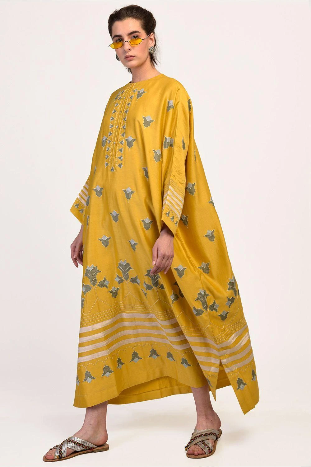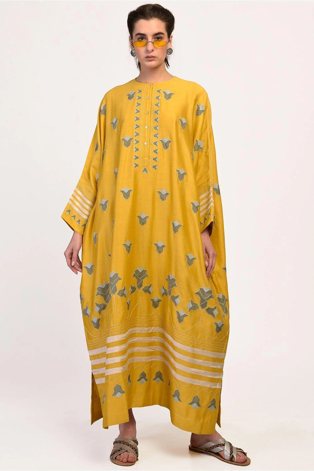 In sunshine yellow, this applique kaftan is perfect for your summer sojourns! Wear it with your colorful shades and bohemian flats. Don’t forget to carry it for your next beach vacay.