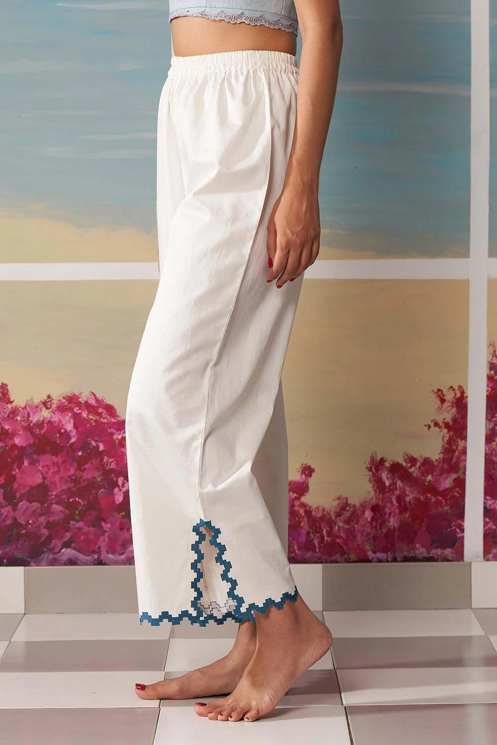 These stylish ivory pants feature hand cut applique details. This versatile pair can be styled with a tunic or kurta to complete the look.