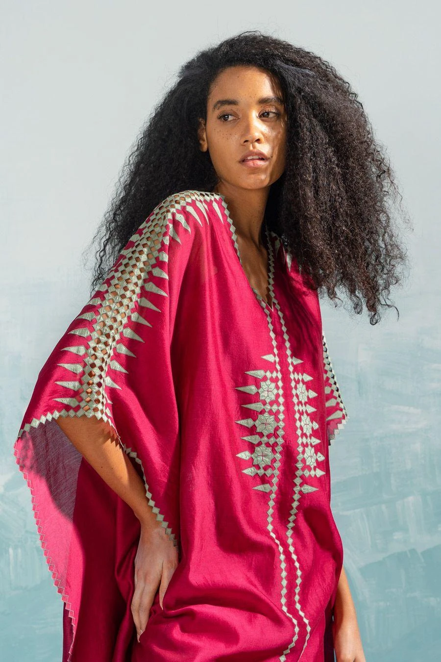 This pink cutwork kaftan falls in the realm of luxe minimalism. Crafted in cotton silk chanderi, this kurta features handcut applique & cutwork details. Style them with the Persian pink high slit cutwork pants from the collection to complete the set.