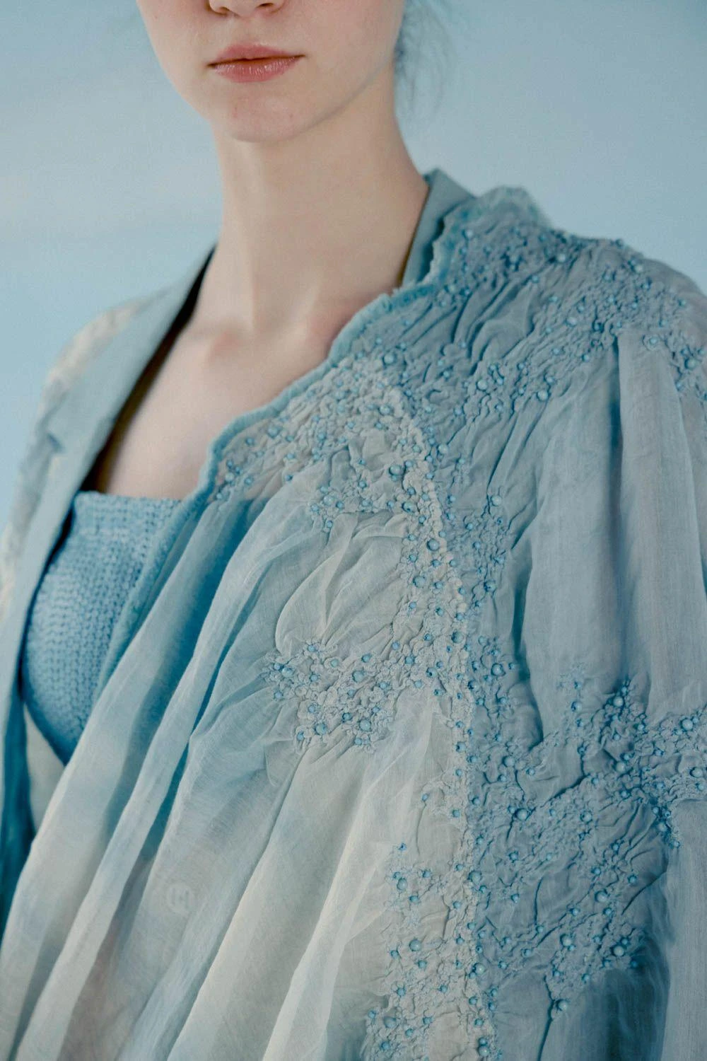 Crafted in chanderi, this ice blue bralette fetaures sequin embroidery with a cotton mul lining. Style this piece with the tie dye chanderi sari with a smocked shoulder to complete the set.