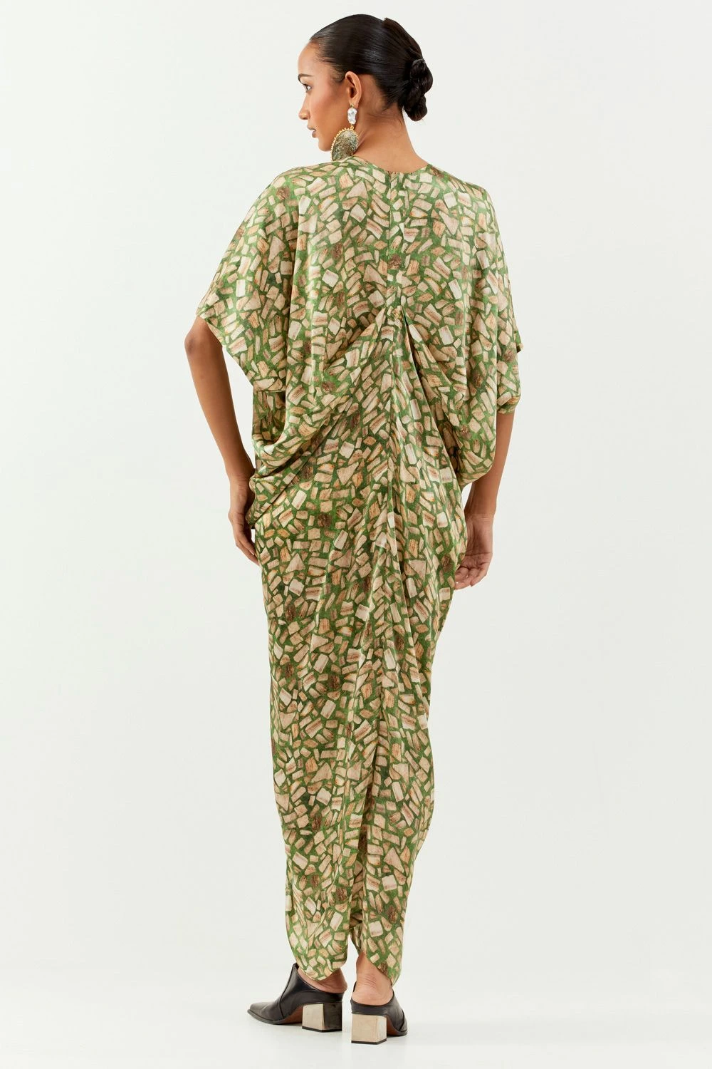 Add a layer of statement and glamour to your resort getaways with this Terrazzo Draped Dress. Impeccably designed, it radiates sophistication and grace, an embodiment of refined style.
