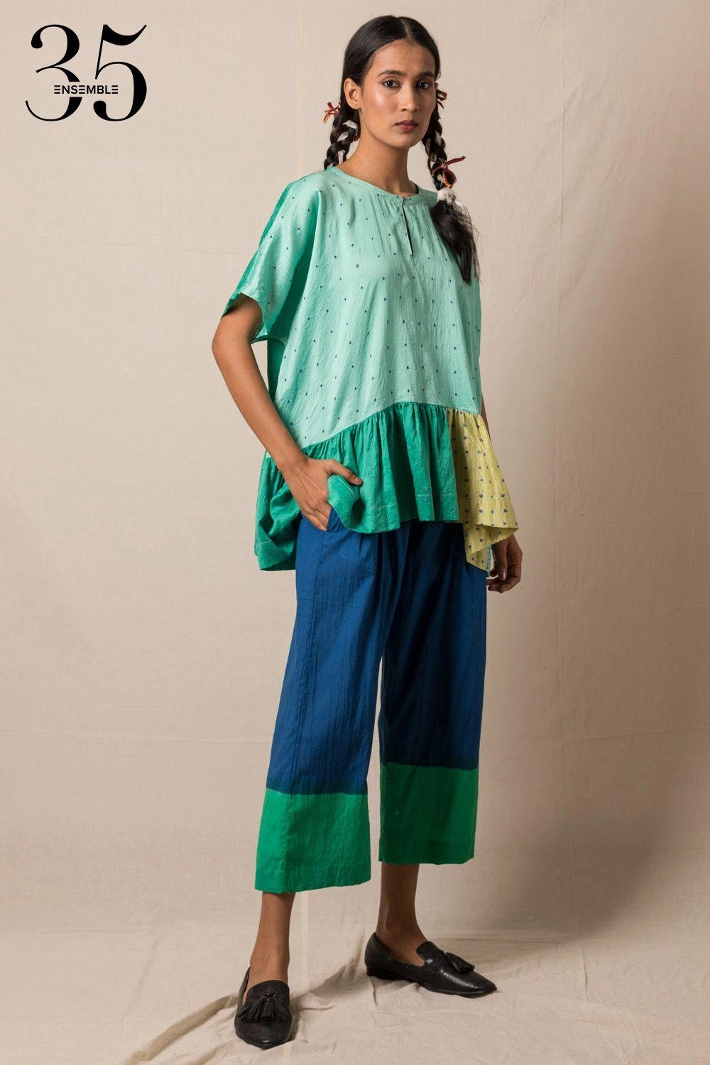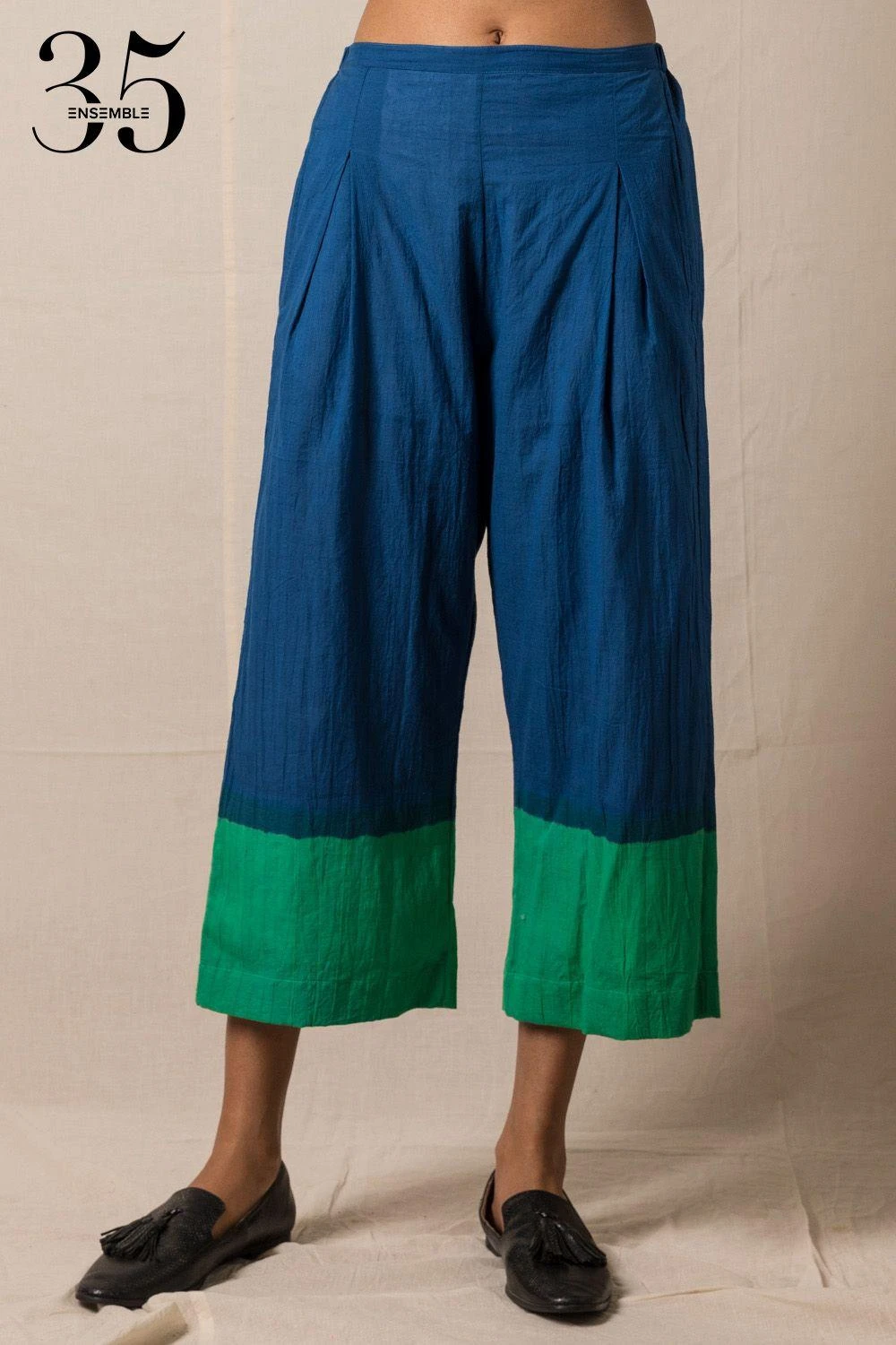 A yearlong celebration of its 35th anniversary telling the story of modern Indian fashion. These comfy chic cropped blue pants are a great way to elevate a basic look. It is cut in cotton with green clamp dye at the hem.