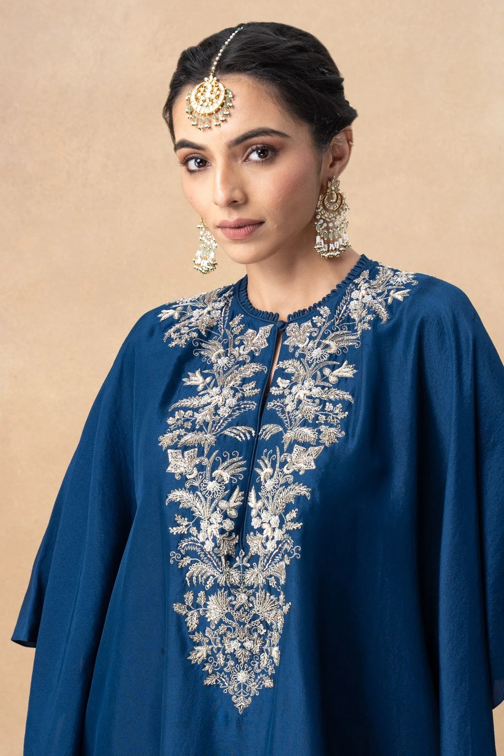 A true masterpiece of artisanal craftsmanship, this kaftan is a celebration of the ancient art of zardosi embroidery, where gleaming gold threads are meticulously woven into sumptuous fabrics.