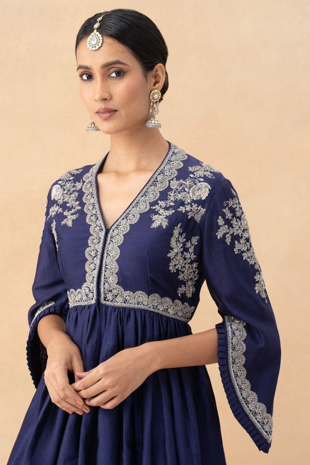 Look effortlessly stylish in this peplum top. Crafted in silk, this top features an embroidered yoke and pleated details. The embroidery gives it that wow factor and it can be styled with a lehenga, dhoti pants or a trouser.