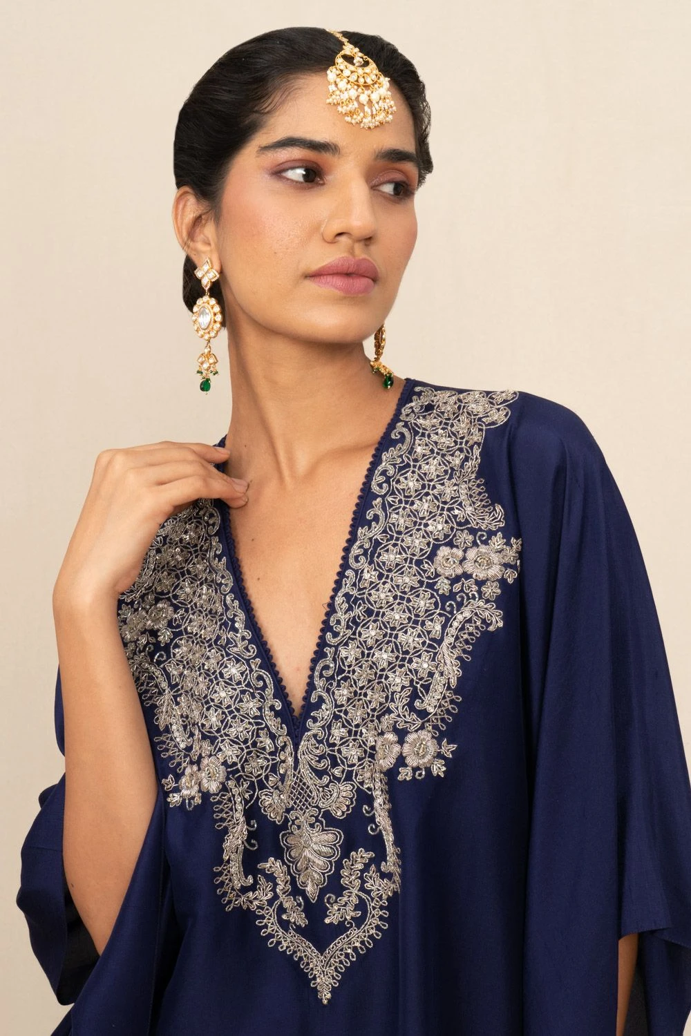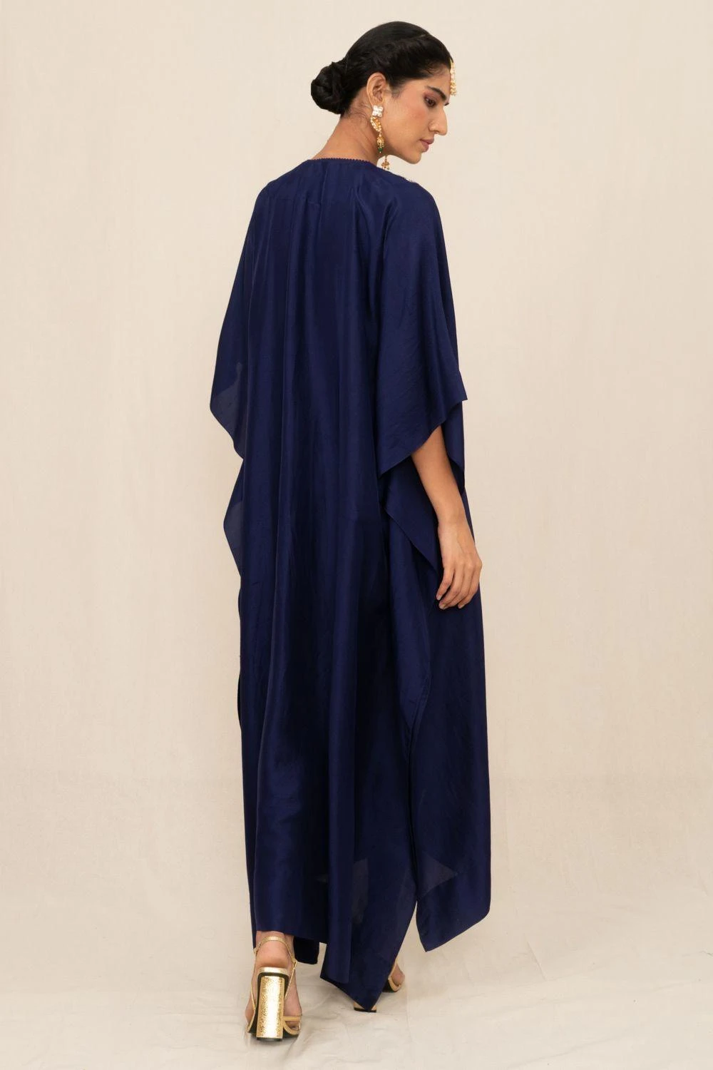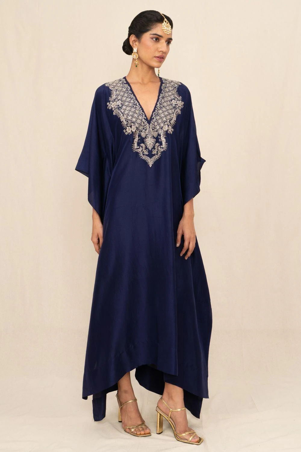 A true masterpiece of artisanal craftsmanship, this kaftan is a celebration of the ancient art of zardosi embroidery, where gleaming gold threads are meticulously woven into sumptuous fabrics.