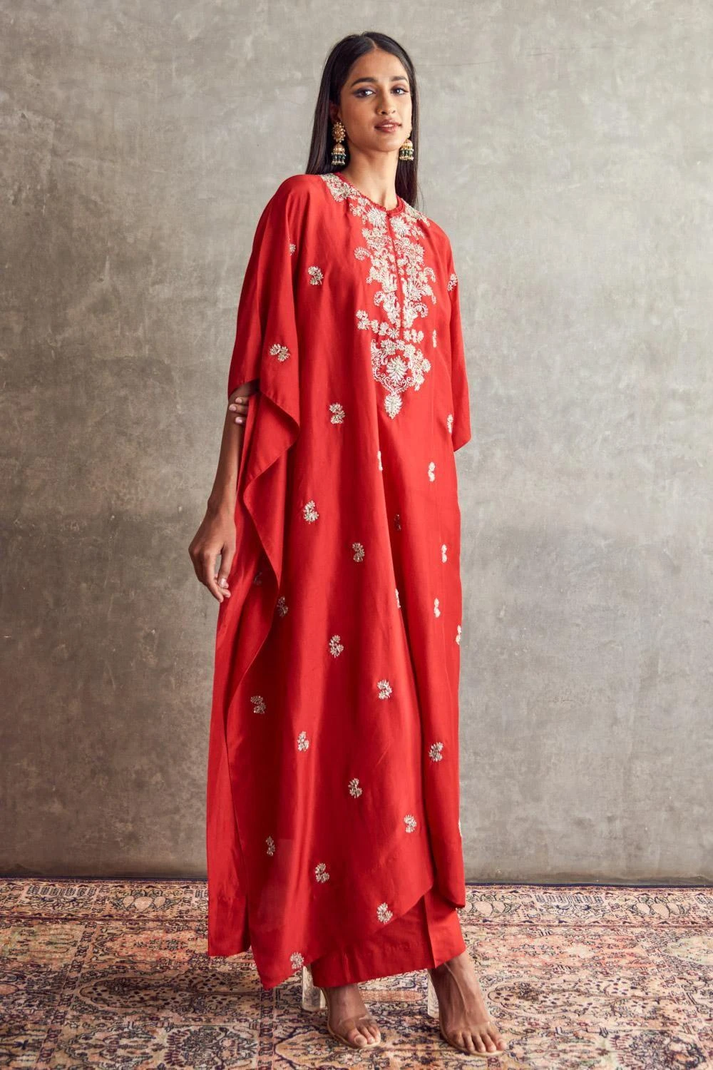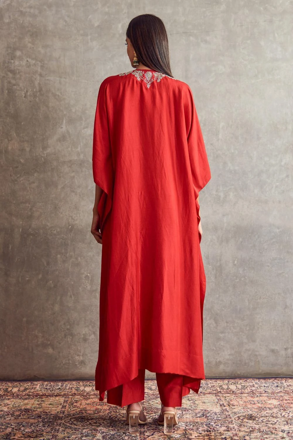 Indulge in sophistication with this Red Embroidered Kaftan harmoniously paired with flowing palazzo pants. This ensemble exudes effortless elegance, offering a blend of comfort and style.