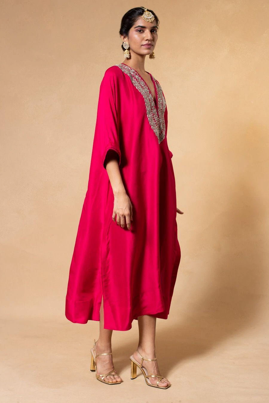 A true masterpiece of artisanal craftsmanship, this kaftan is a celebration of the ancient art of zardosi embroidery, where gleaming gold threads are meticulously woven into sumptuous fabrics.