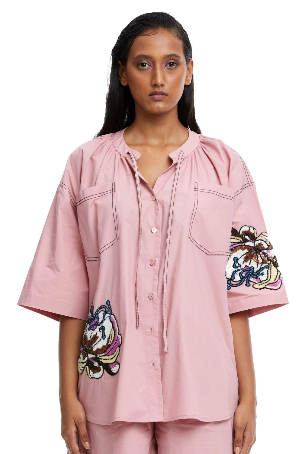Look effortlessly with this Pink Hand-Embellished Shirt. Its exquisite ruching at the waist adds a touch of sophistication, making it a statement piece for your refined collection.