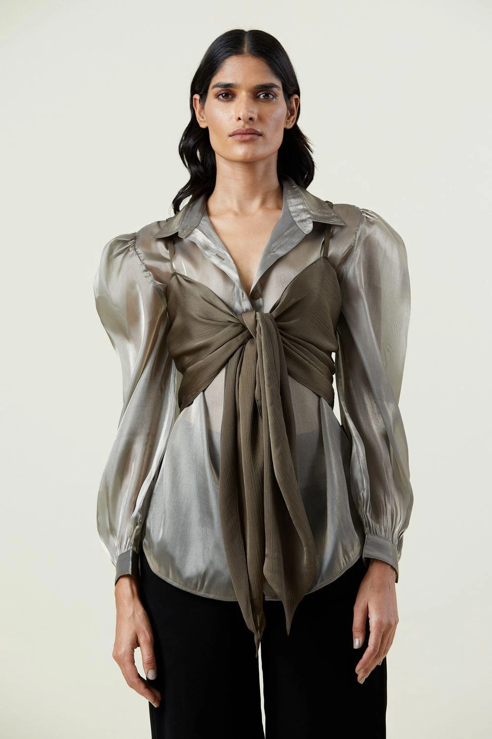 Indulge in opulence with this solid brown tie-up top. Each piece is a masterpiece, adorned with meticulous detailing, offering an ensemble that effortlessly captures sophistication and style.