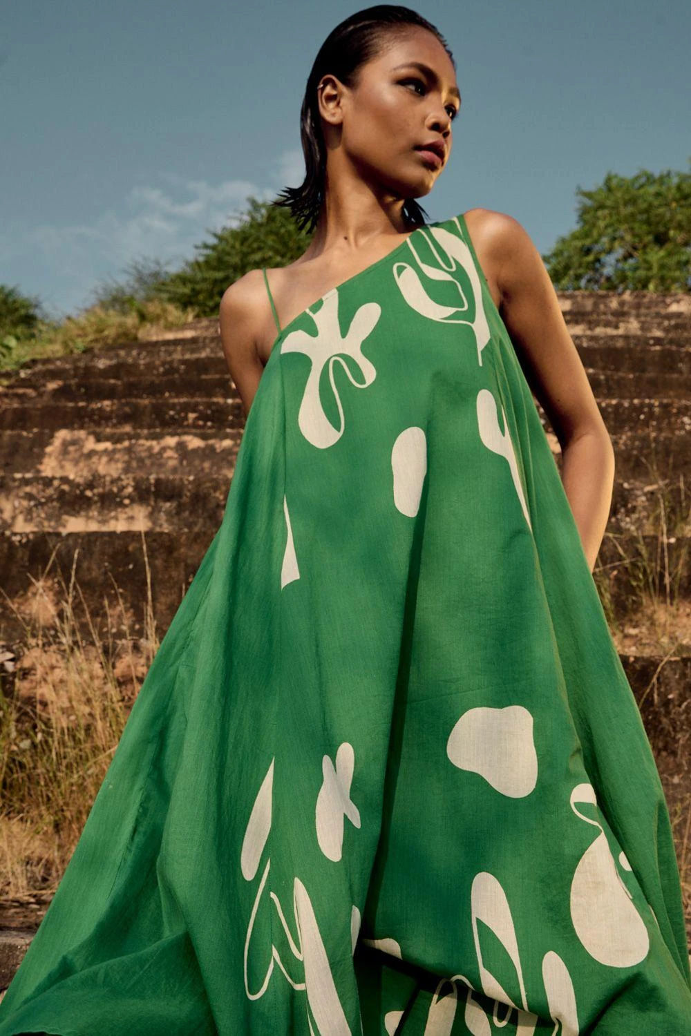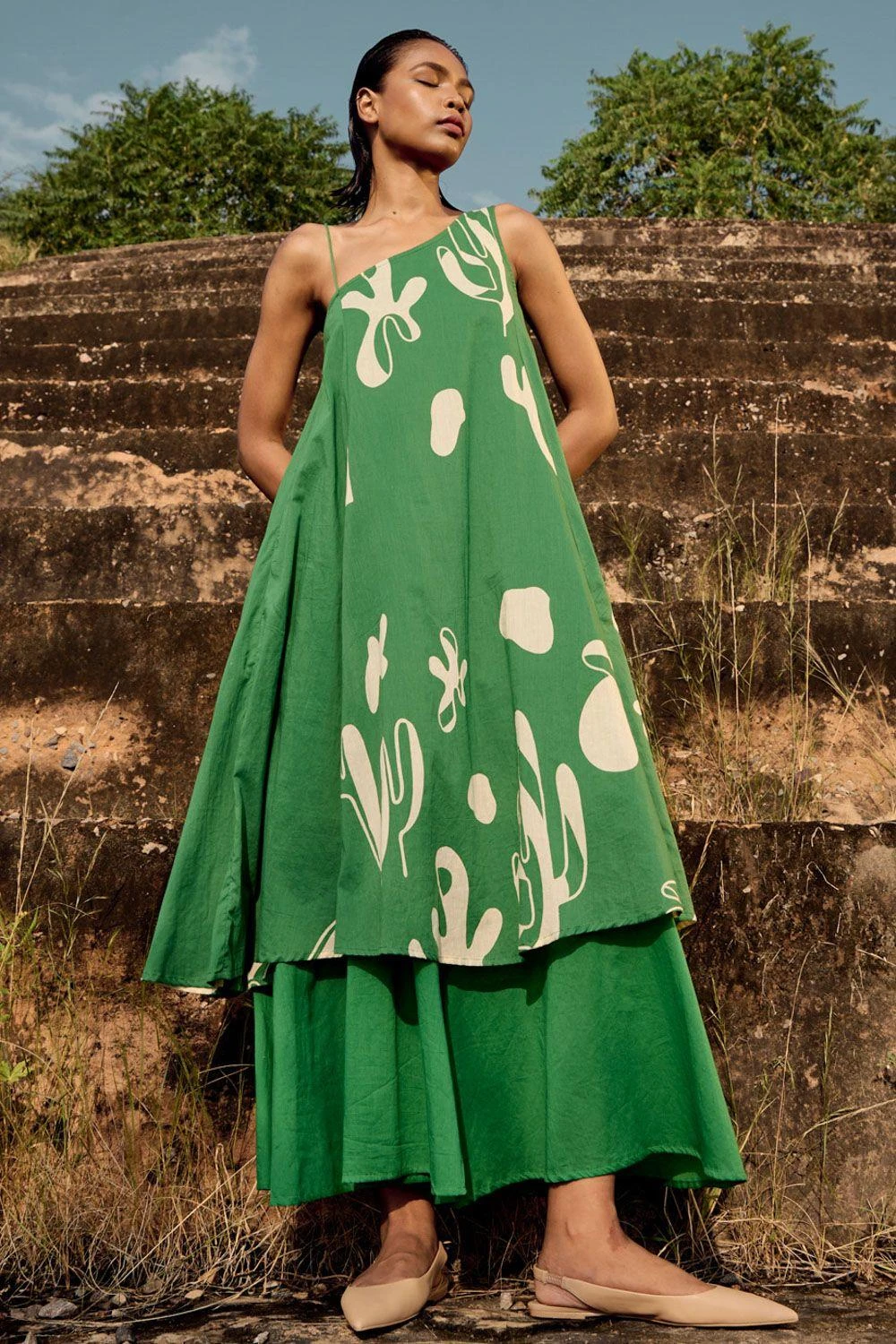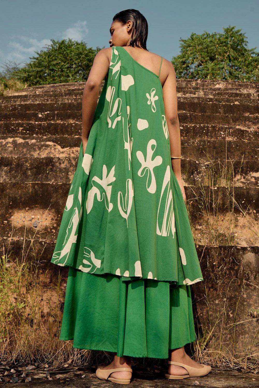 Elevate your style with this Forrest Green Lino Print Mul Dress. This enchanting piece boasts a graceful double-layered hem, adding an extra touch of elegance to your wardrobe.