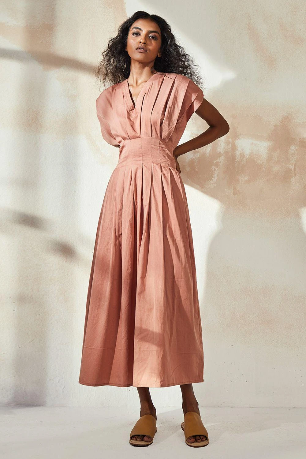 Elevate your style with this blush pink waist-fitted dress. Featuring pleated details, graceful kaftan sleeves, and a flattering V-neckline, it’s a sophisticated choice. The elastic band at the back ensures comfort and a perfect fit.