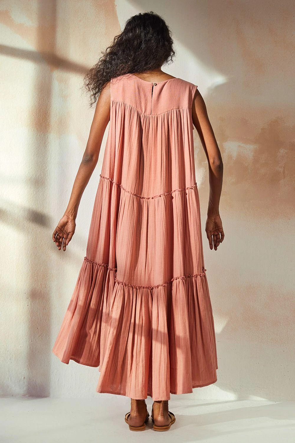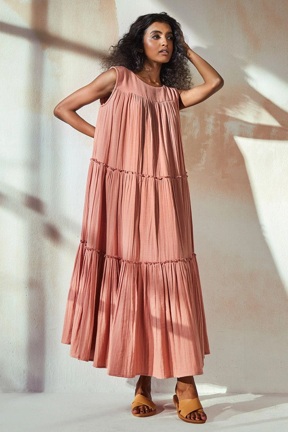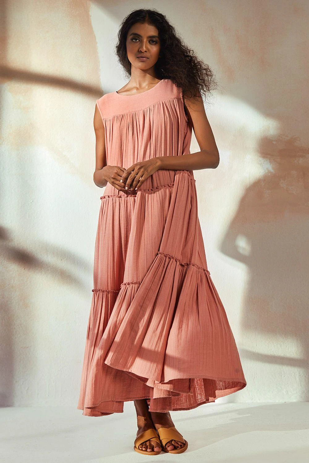 Step into the world of elegance with this rust pink tiered dress. Featuring intricate gather detailing and a sleeveless chest yoke, this dress is a testament to timeless style and grace.