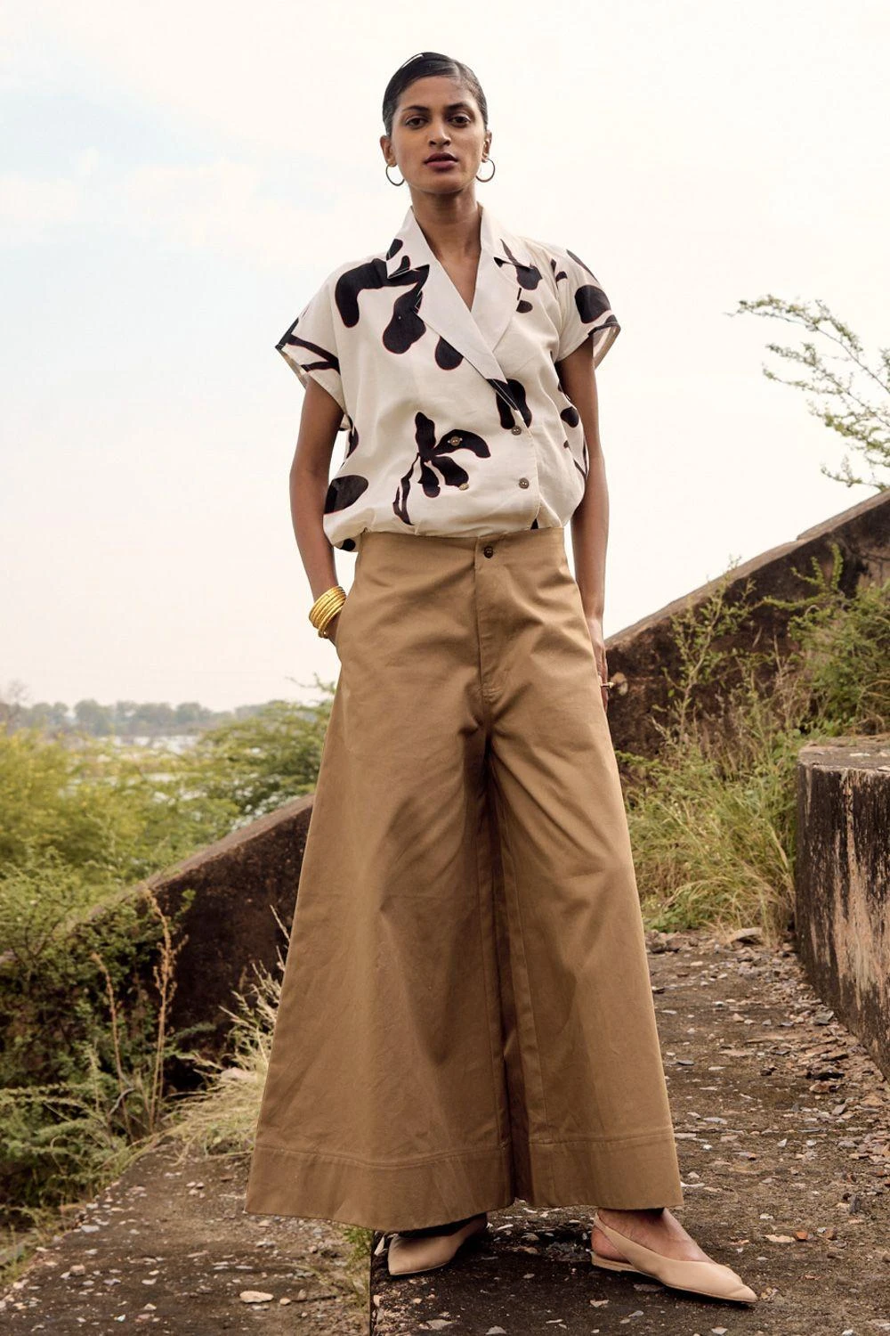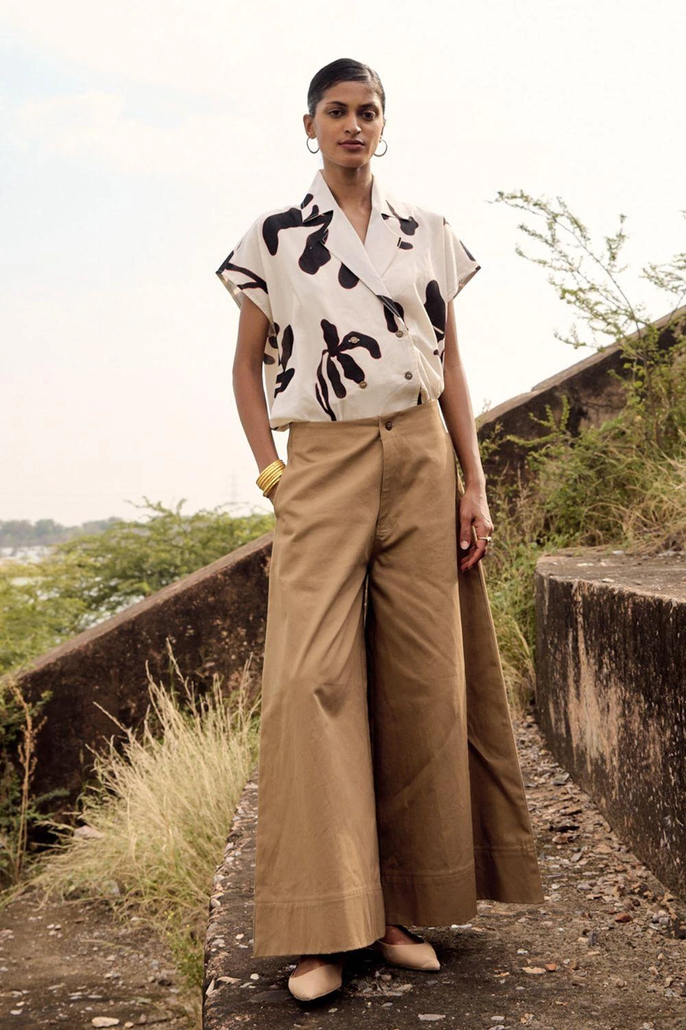 Elevate your style with these twill flared trousers. These bottoms feature a refined front button opening, adding a touch of sophistication to your ensemble.