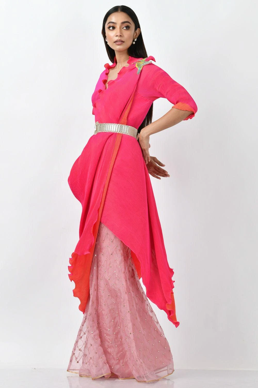 Elevate your subtle looks with these light pink sharara pants. Set in a pleated polyester mix, they are enhanced with mirror work details. You can team it up with a wrap from the collection for a festive look.