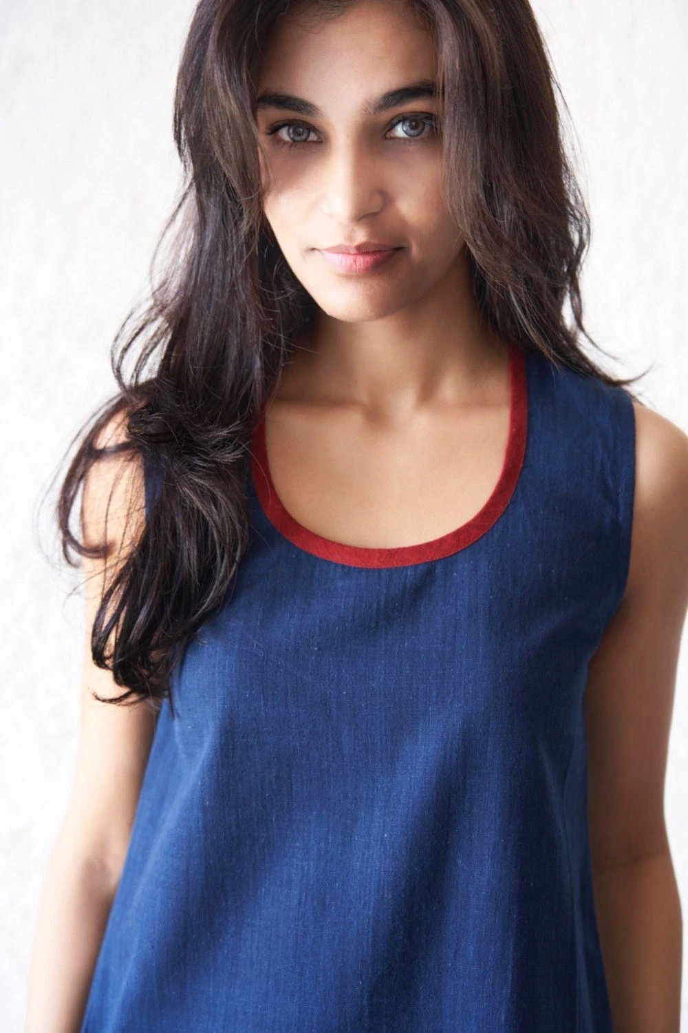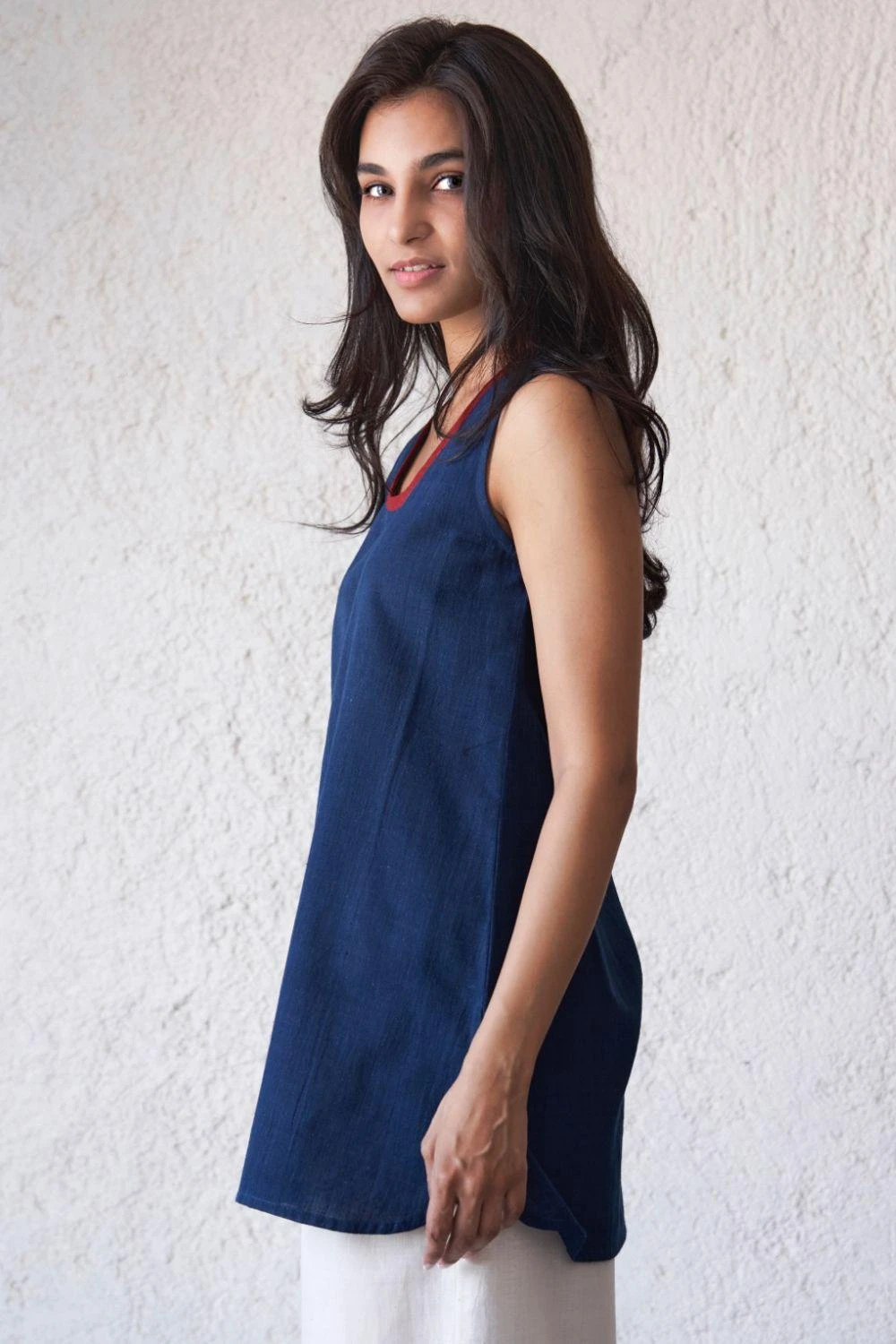 The perfect amalgamation of style and comfort, this top is perfect for a day out. Crafted in handspun handwoven cotton, this sleeveless top features a U-neck & is dyed in natural indigo.
