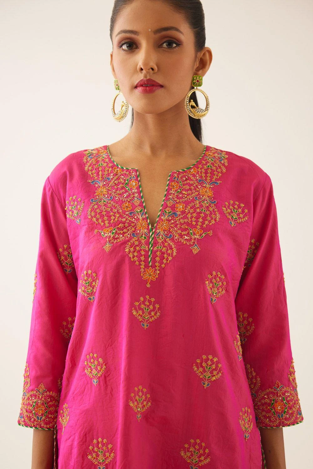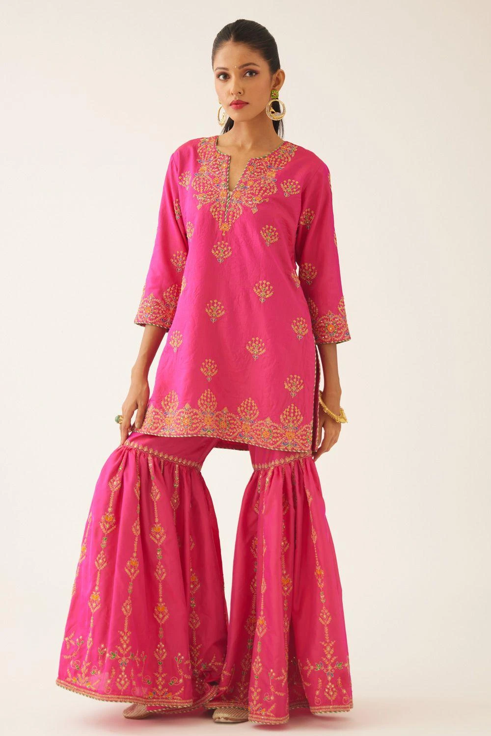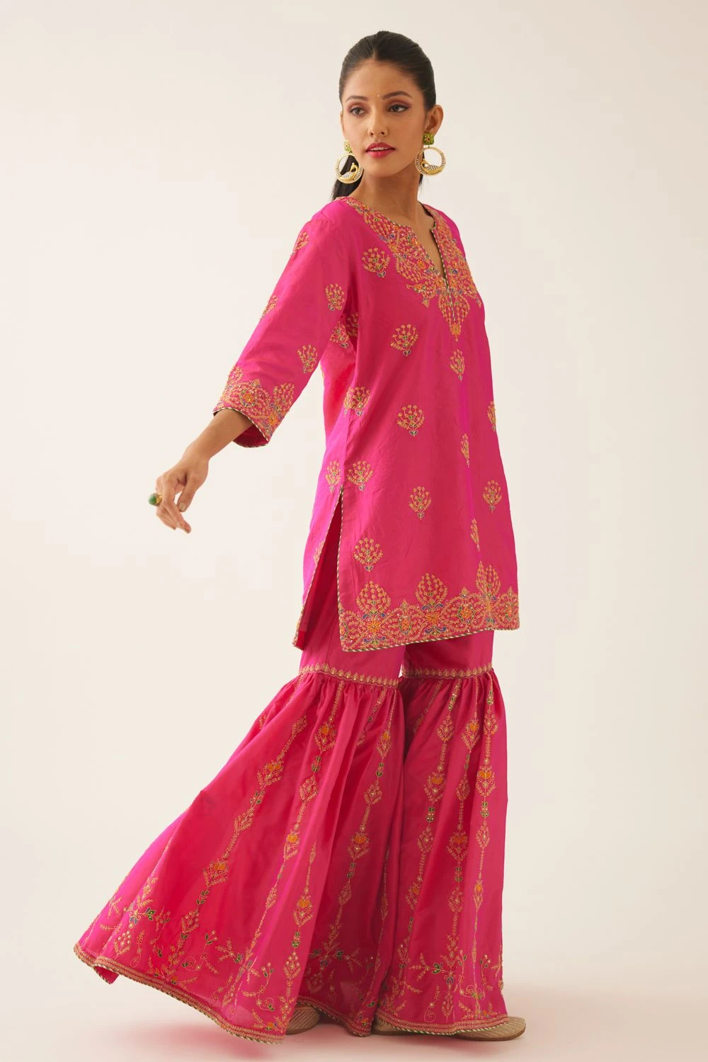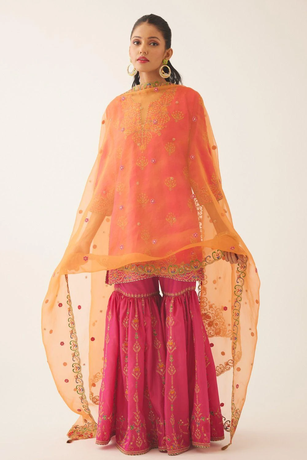 Step into elegance with this Short Kurta Set. The kurta features intricate dori and silk thread embroidery with bead & sequin highlights. Paired with a Farshi with dori embroidery & contrast beadwork & an organza dupatta, this ensemble exudes grace.