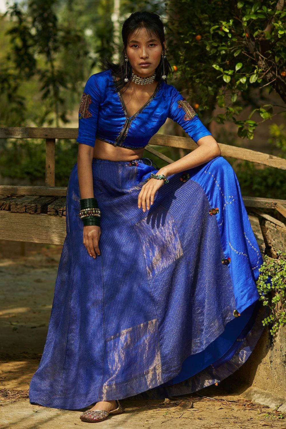 Get in the spirit of festivities with a vibrant outfit that is as traditional as it gets with this peacock blue lehenga. It is curated with hand tied bandhani panels, tissue & chiniya patchwork, paired with a hand embroidered blouse and a dupatta.