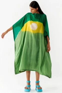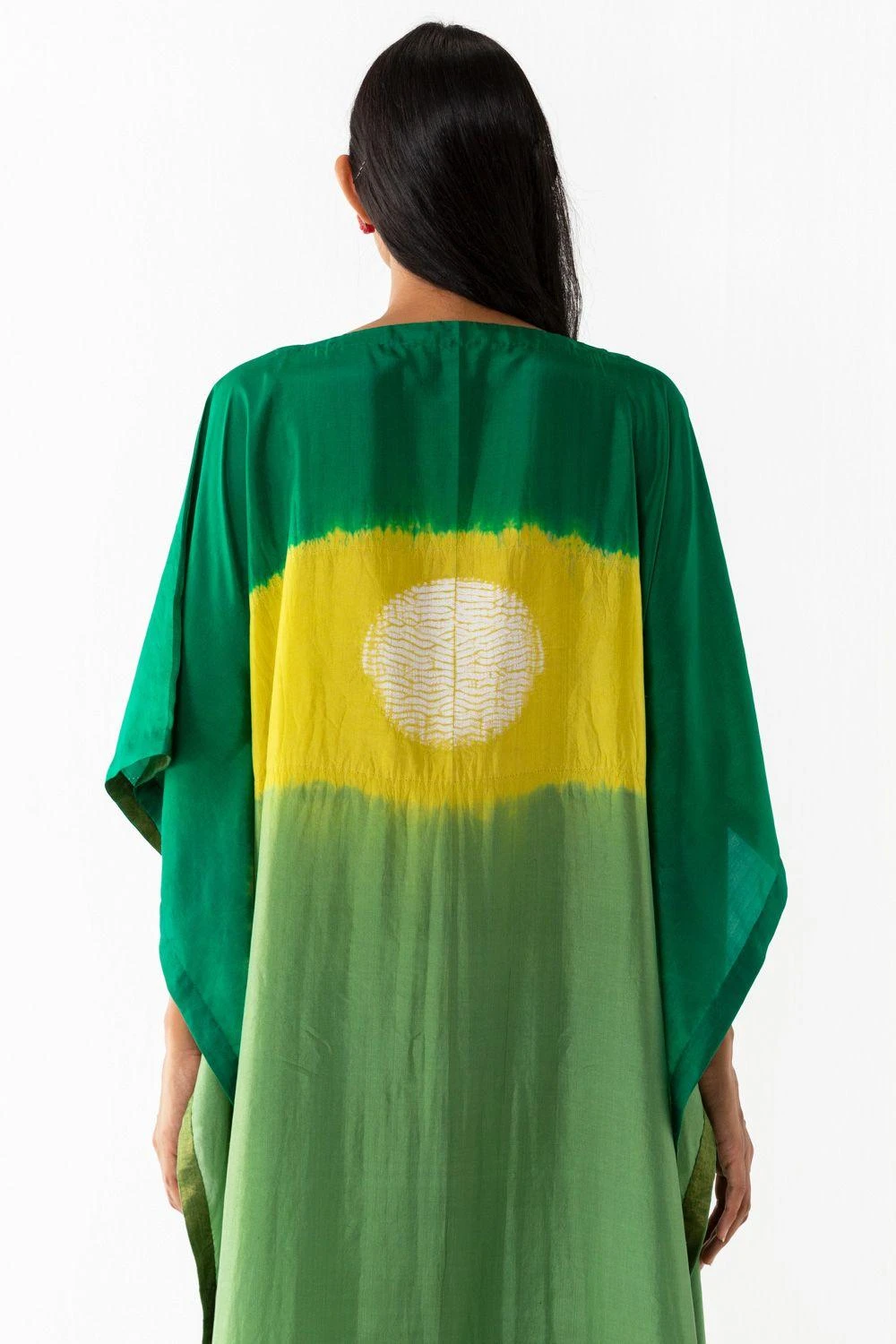 Lounge in or go out, do not compromise on the comfort & luxury with this free size kaftan in hand woven silk. It features an abstract colour-blocked pattern hand-dyed in summer tones of lime, olive & emerald green.