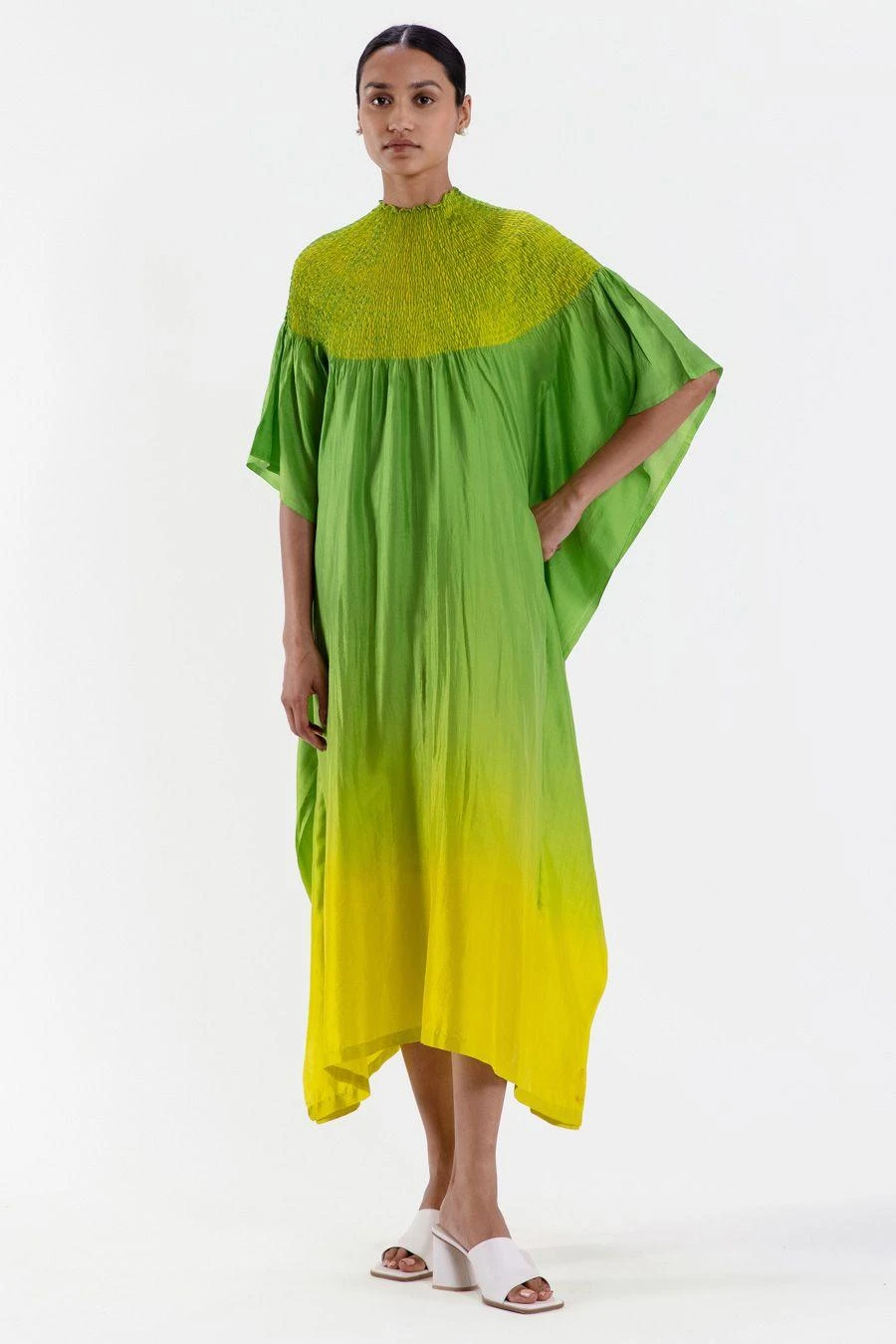 Elevate your wardrobe with this kaftan, featuring a shibori neckline dyed in gorgeous shades of lime & yellow. This statement piece is crafted with the utmost care & attention to detail, ensuring a flawless finish that exudes sophistication & style.