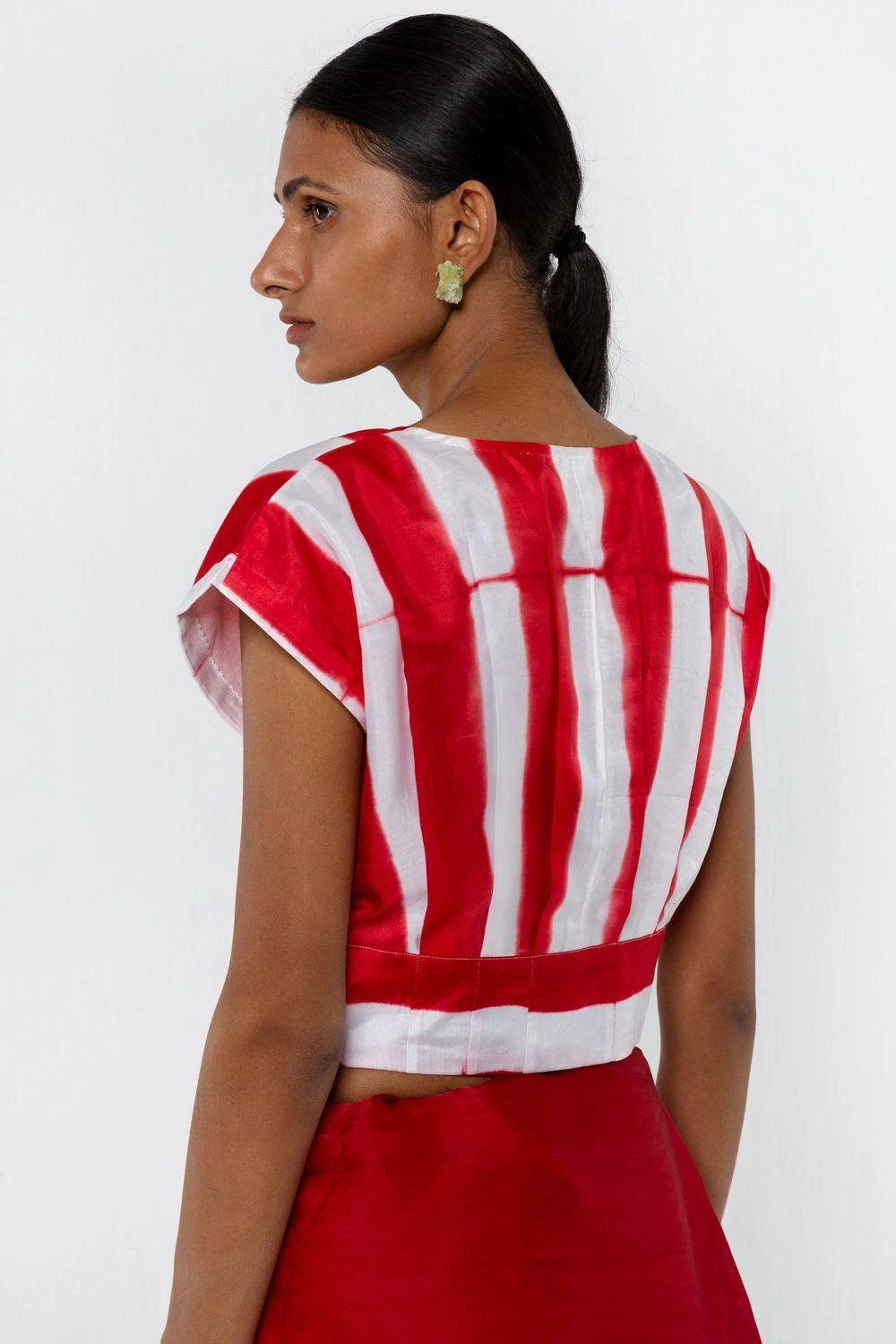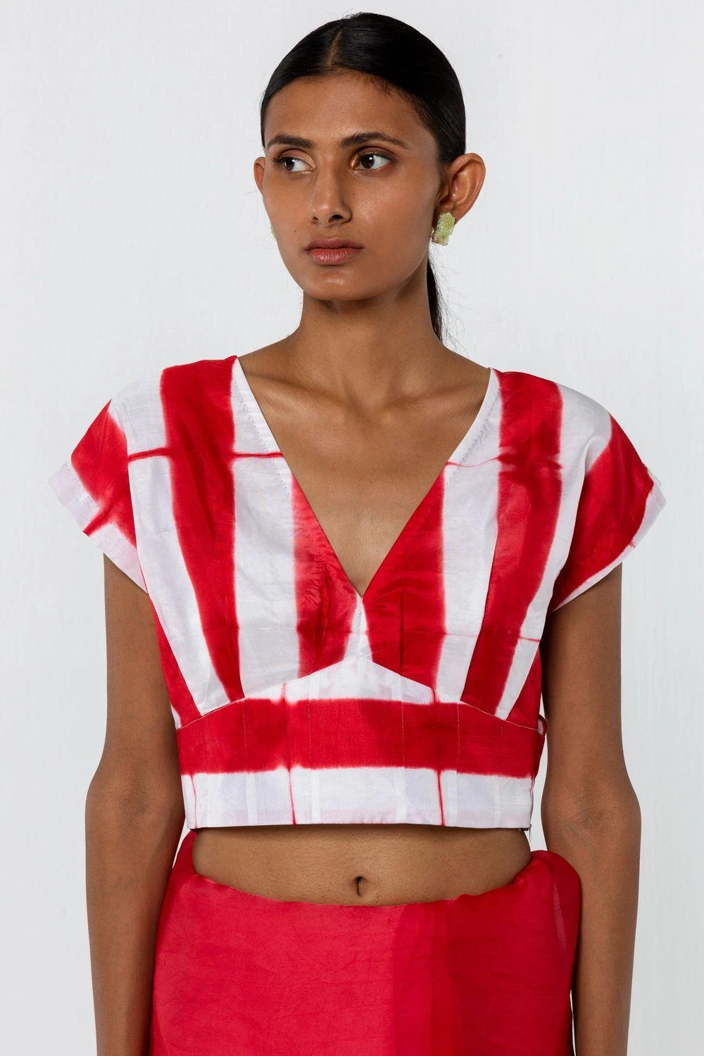 This hand woven silk V-neck blouse in a white base, will perfectly compliment your understated saris. It features an itajime shibori pattern hand-dyed in red.