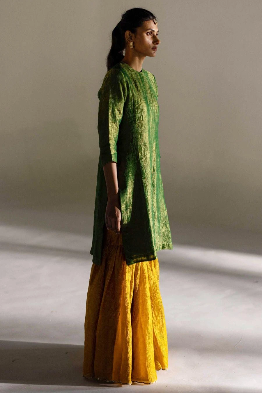 Indulge in Mimamsaas understated luxury & fine craftsmanship with this emerald green gharara set. The kurta & sharara are woven & embroidered with rich tissue silk and comes with a matching dupatta.