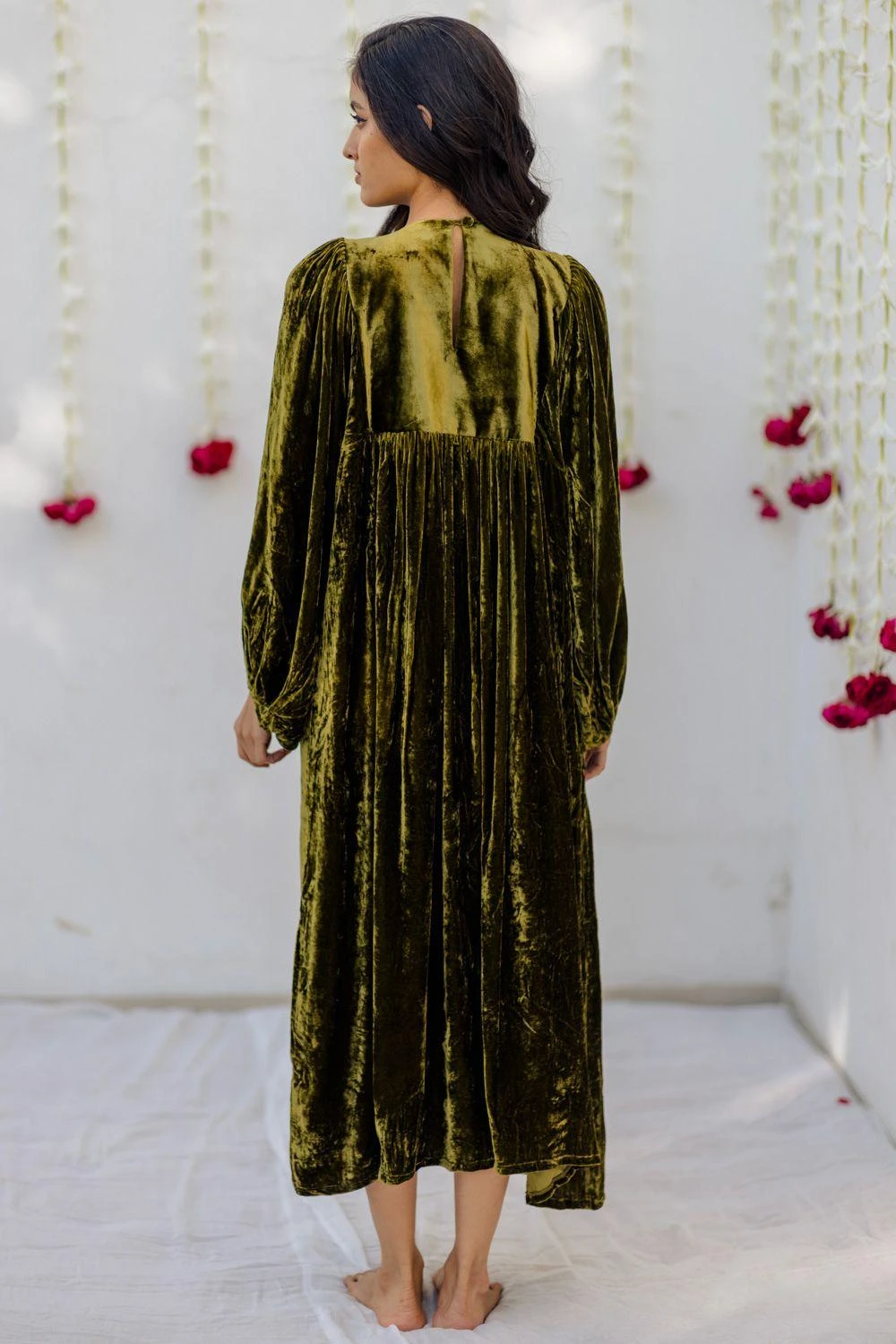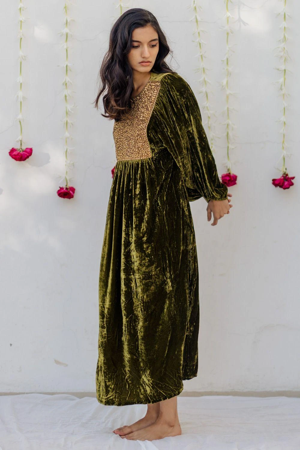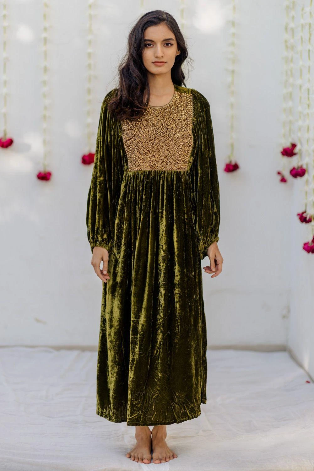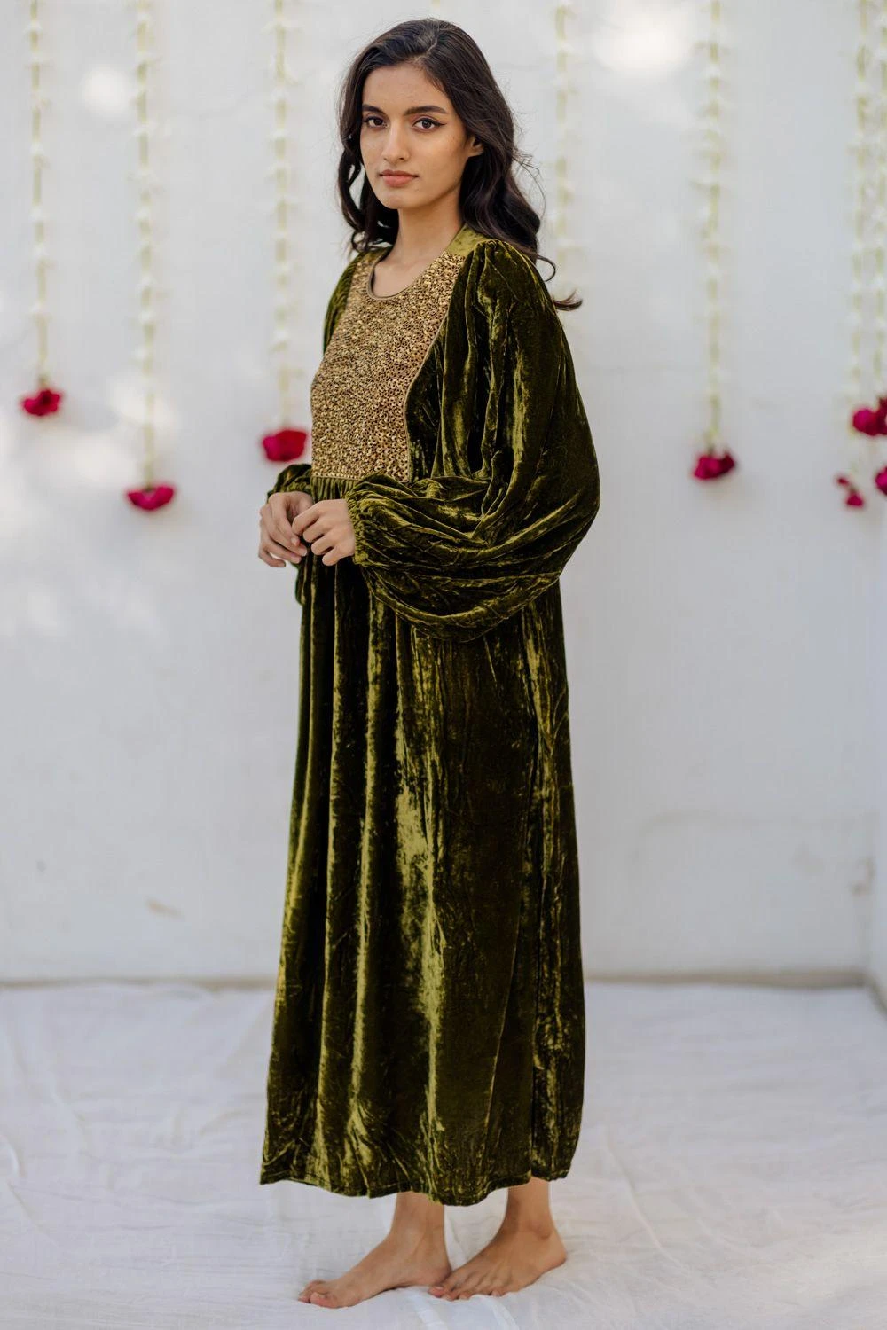Elegance comes in ease with this olive green kaftan dress. It is crafted in royal velvet fabric and uplifted with scintillating gold hand embroidery detail on the yoke. You can style it with a pair of statement studs for an intimate occasion.