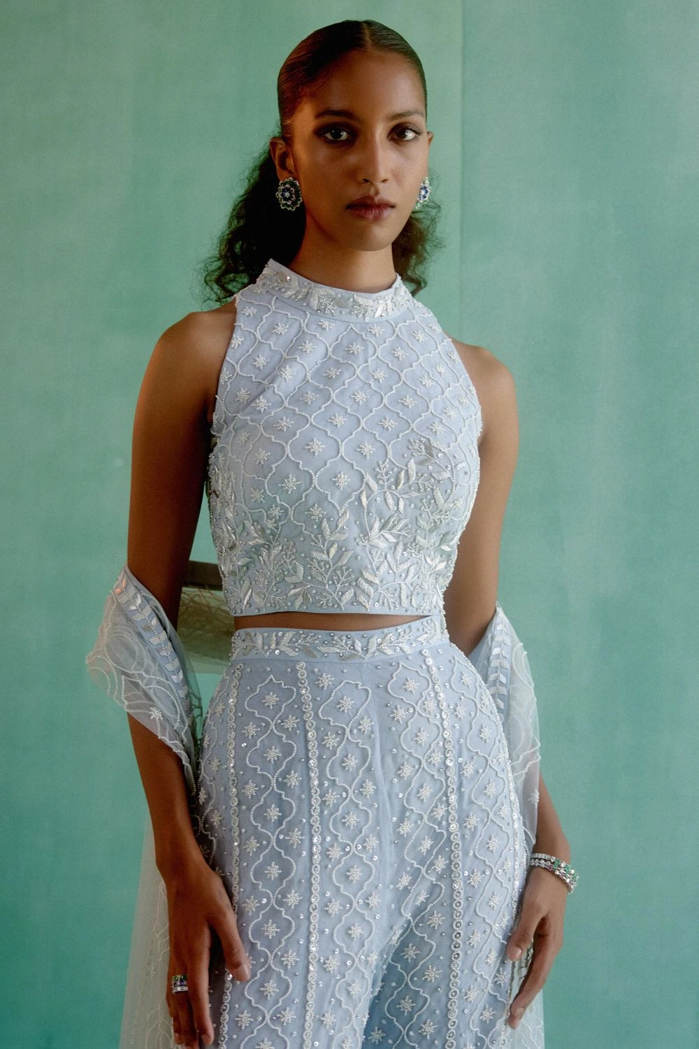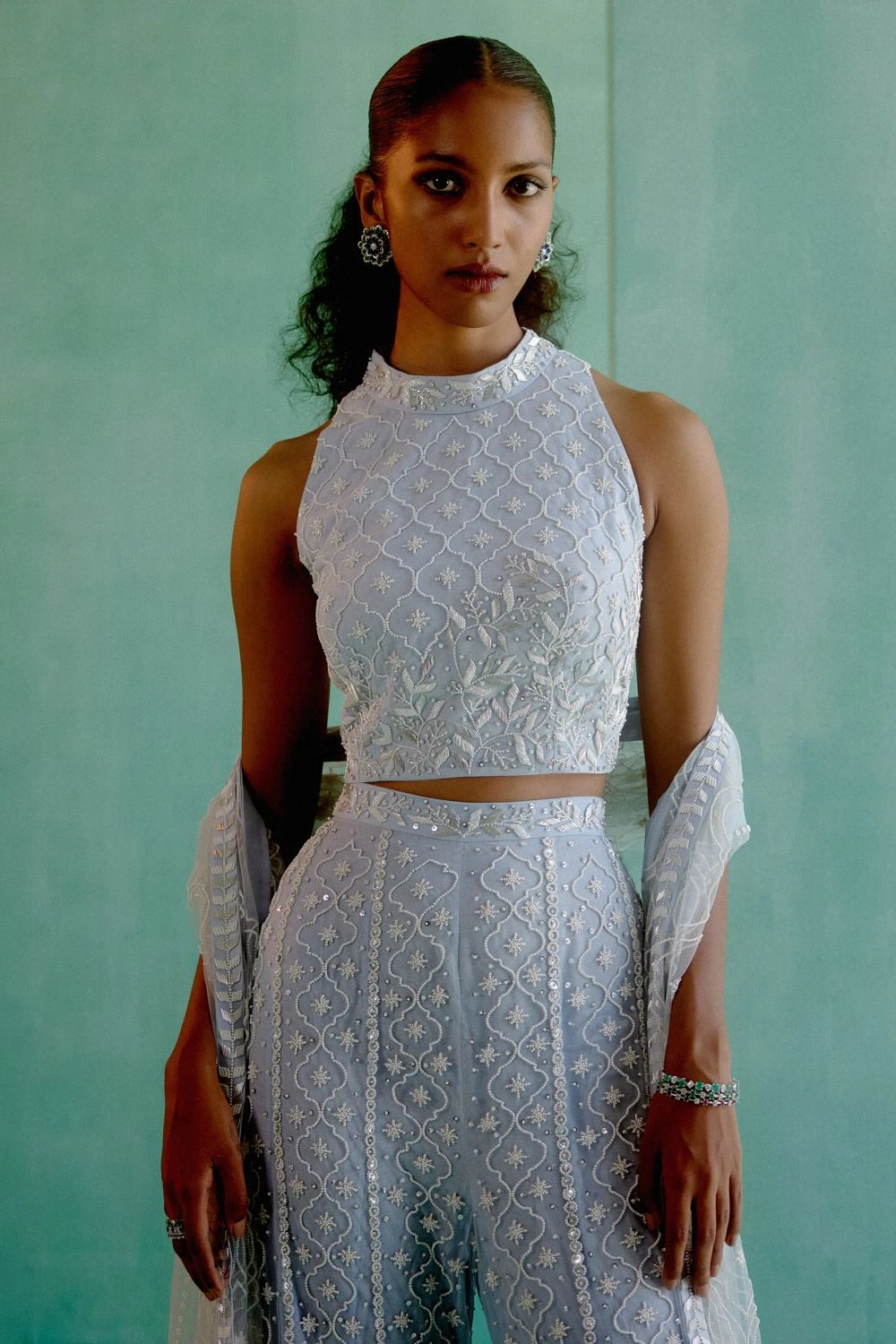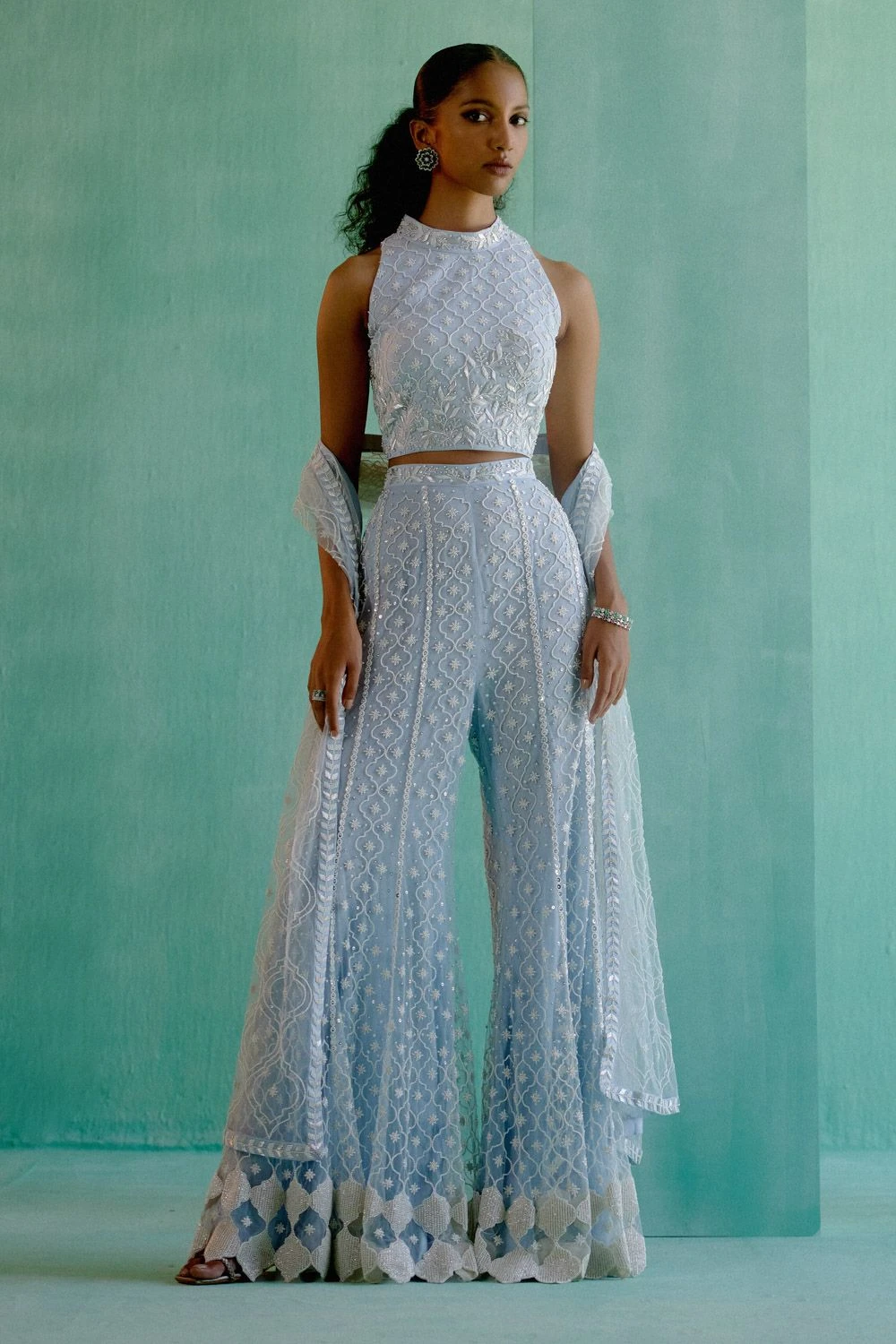 Indulge in elegance with this logo jaal sharara set. Complete with a crop top and dupatta, it’s a chic and stylish ensemble that elevates your fashion statement.