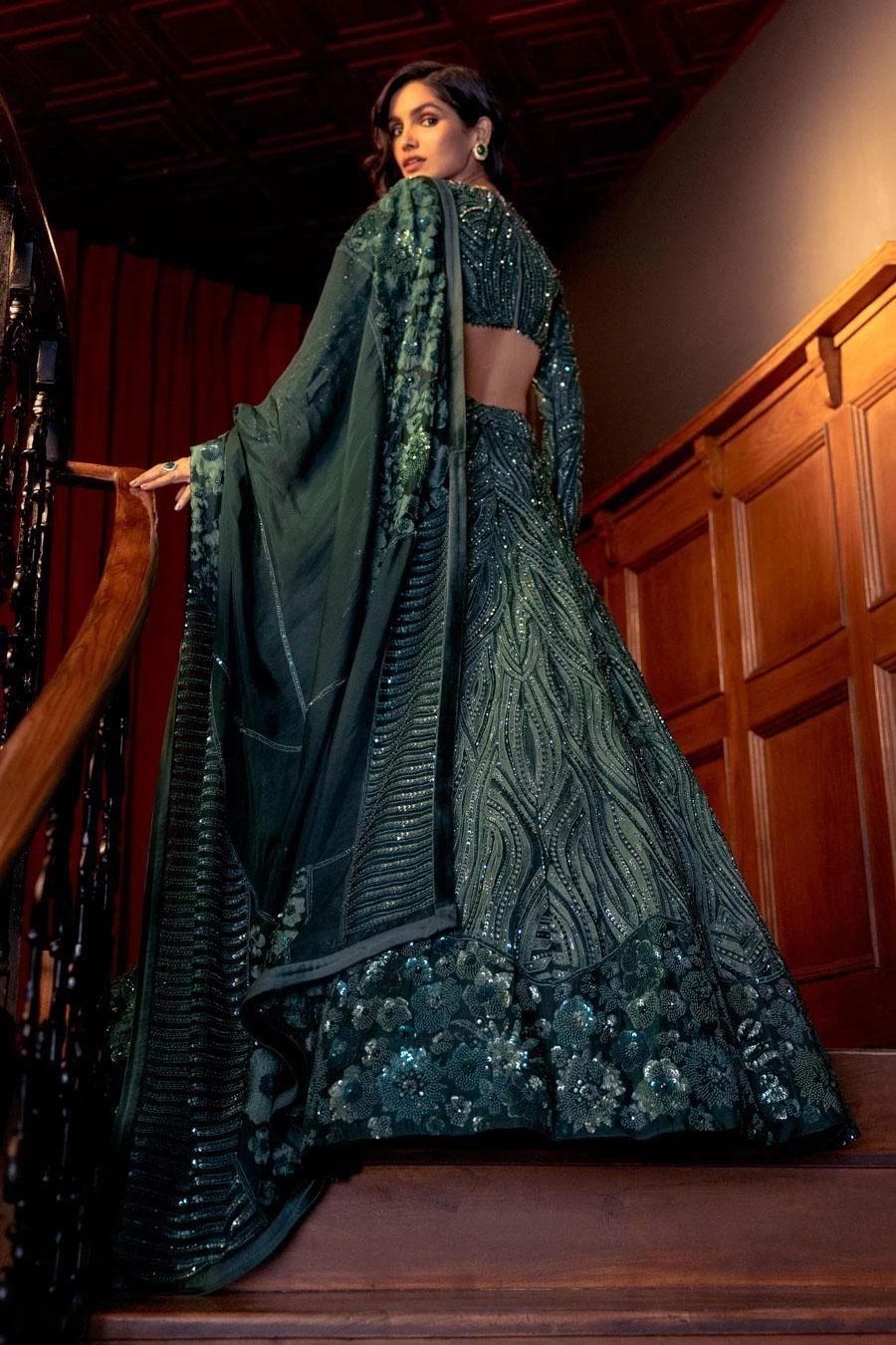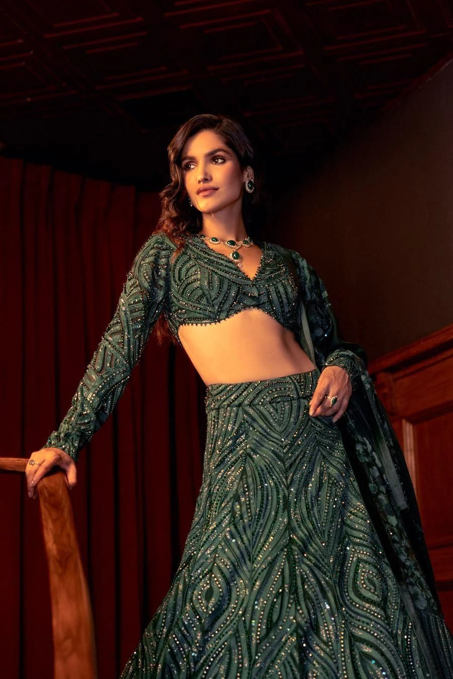 For your wedding adjacent celebrations or festive occasions, this green lehenga set is a great option for a relevant yet rooted look. Crafted in organza and soft tulle, this set features a floral embroidered lehenga paired with a blouse & a dupatta.