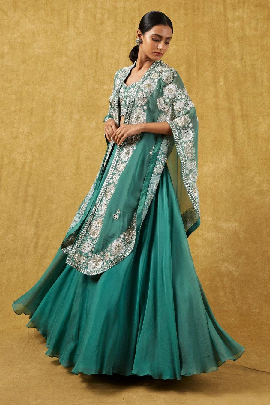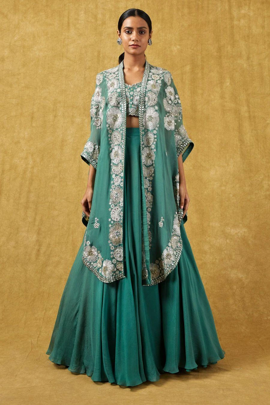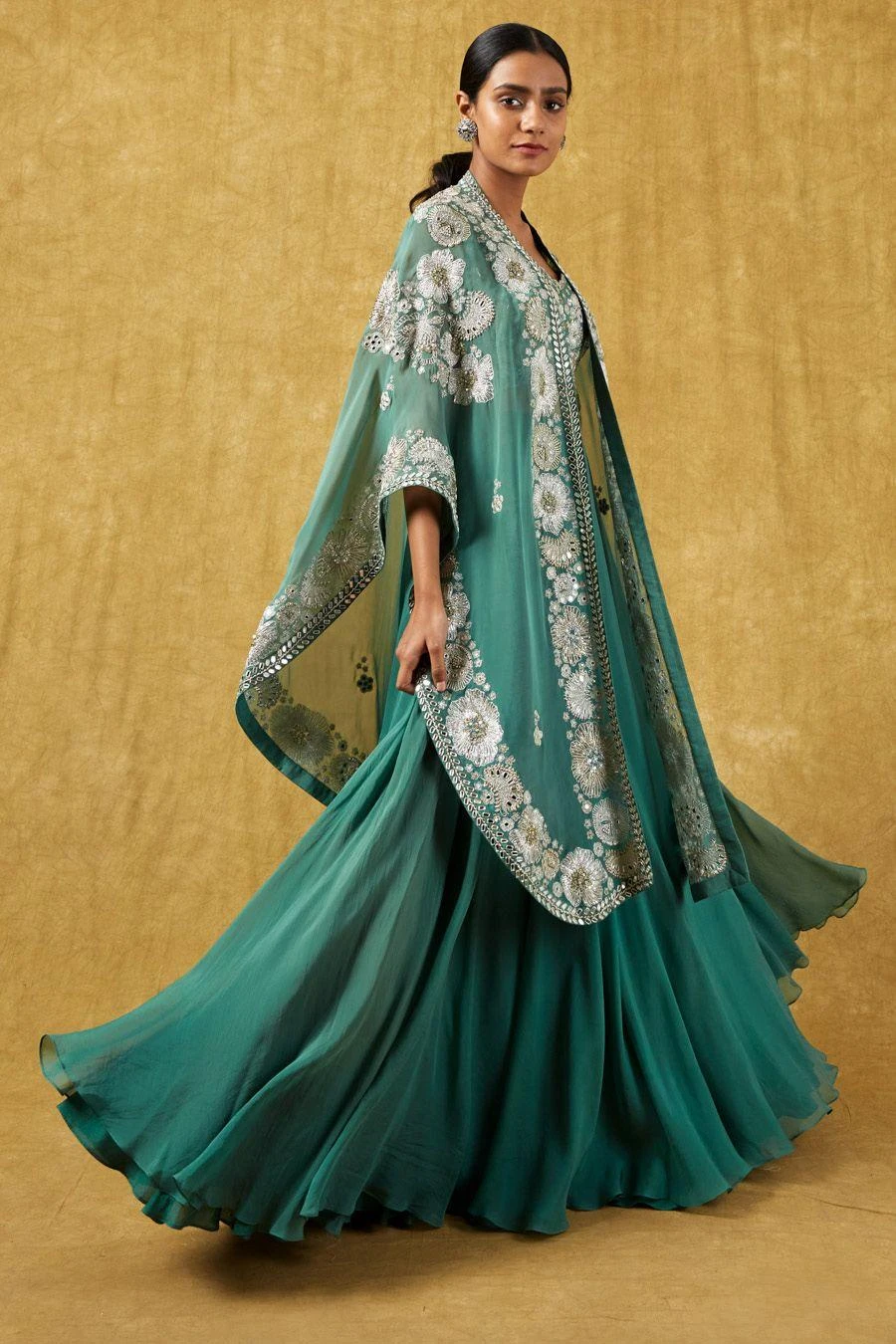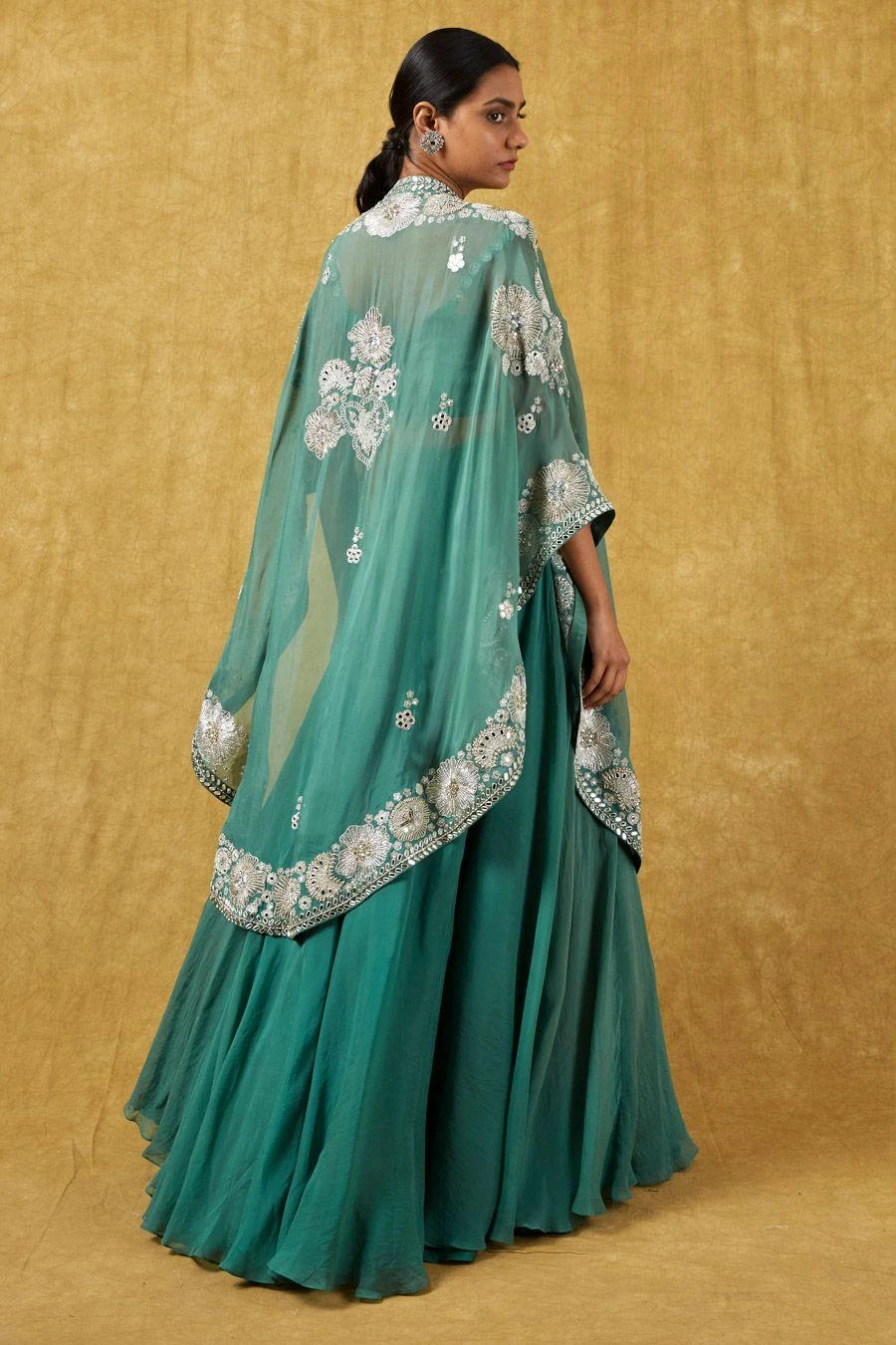 Swap your dupattas with capes this festive season. This wine hued set features a floral cape paired with a crop top & pants. It is hand embroidered with silk threads, French knots, zari, mirrors & sequin work.