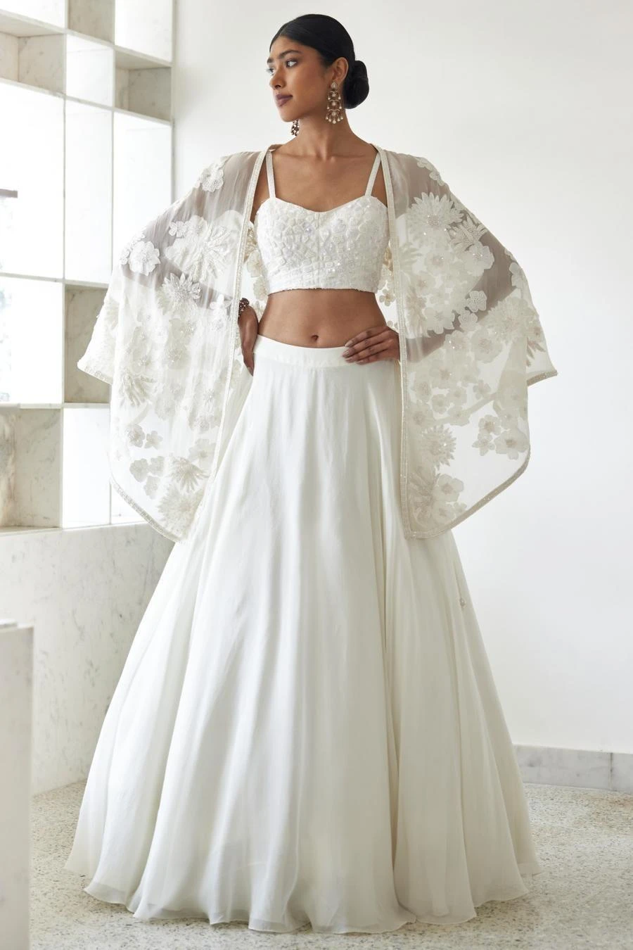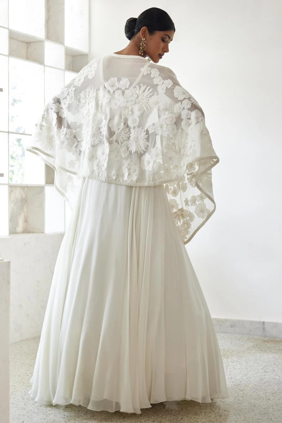 Swap your dupattas for capes this wedding season. Crafted in organza, this set features an embellished cape paired with a crop top and a lehenga. Add a pair of statement earrings to complete the look.