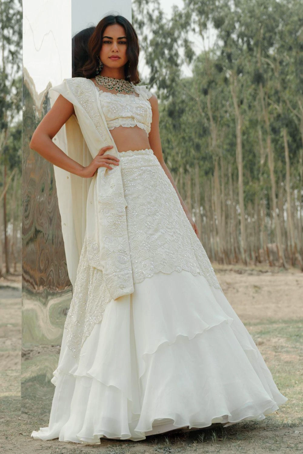 This lehenga set will see you through all kinds of fesivities. It features an embroidered lehenga paired with floral embroidered blouse and dupatta. This set features hand embroidery finished with silk threads, cutdana and sequin work.