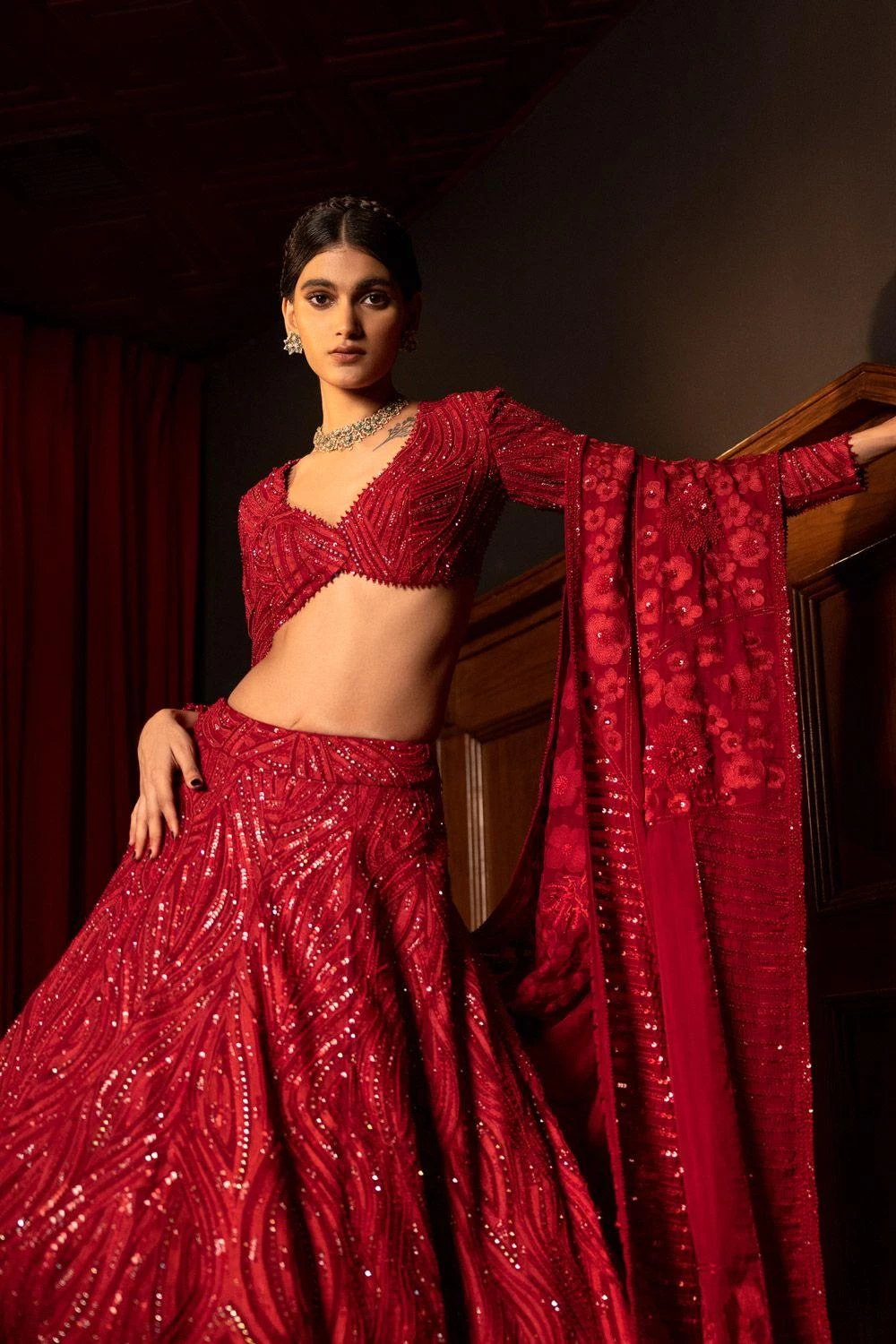 Experience the artistry of this abstract lines and floral embroidered lehenga, exquisitely paired with a detailed Art Deco dupatta & blouse. This ensemble captures the essence of elegance & sophistication, making a statement at any grand celebration.