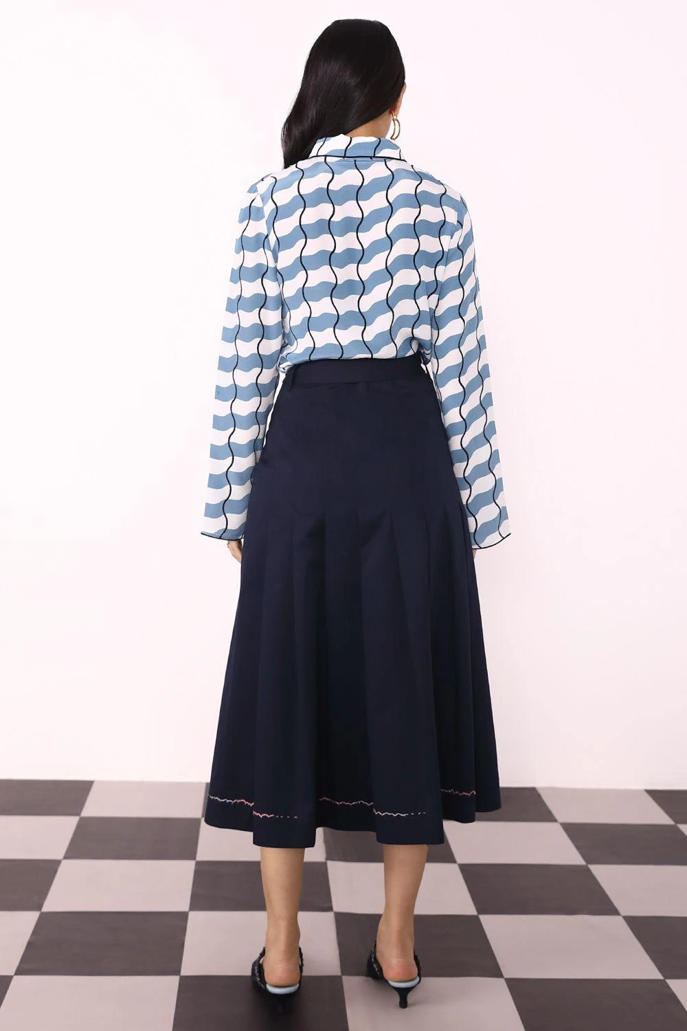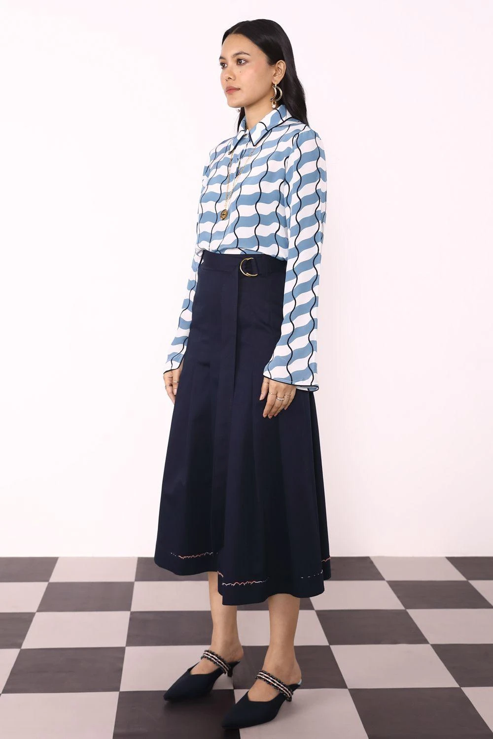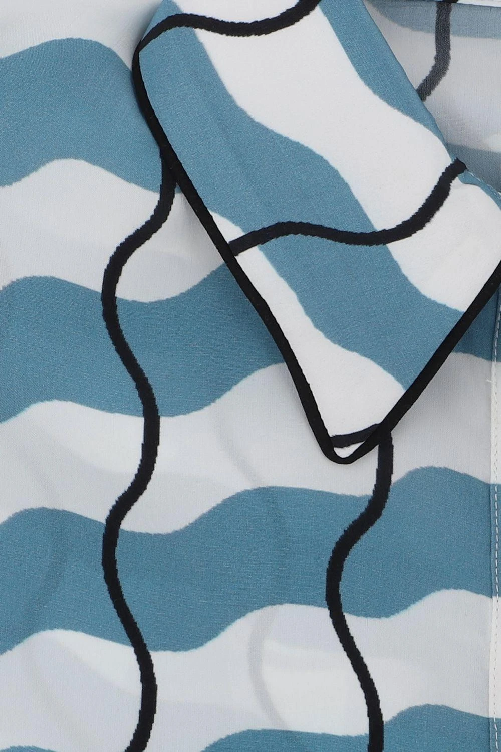 This wave checks printed blouse will take you from the boardroom to the bar in style. It features a classic collar edged with black piping and full sleeves with a notched hem. Pair this shirt with some jeans and hoops.