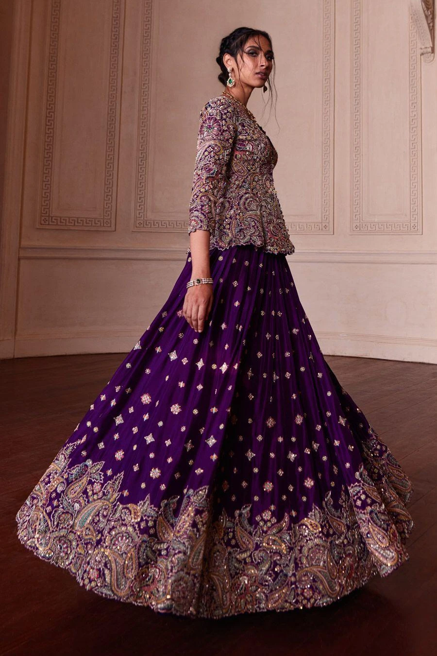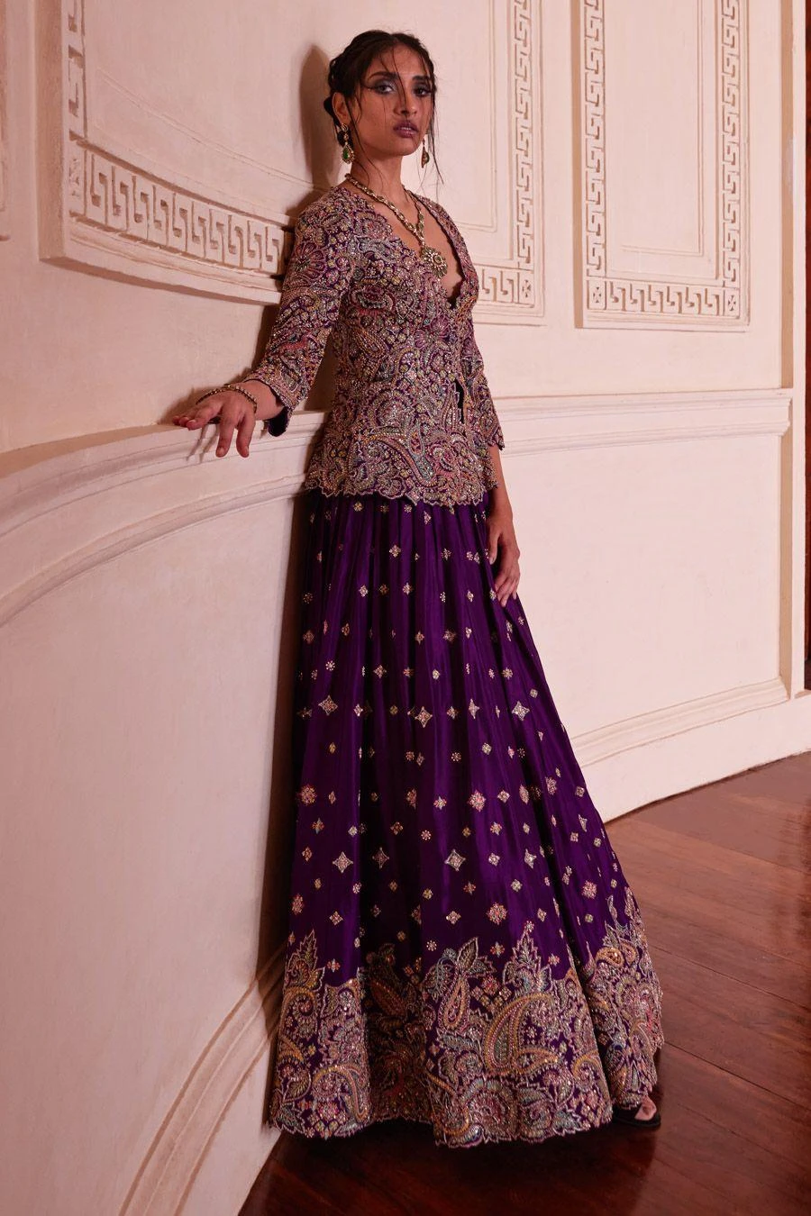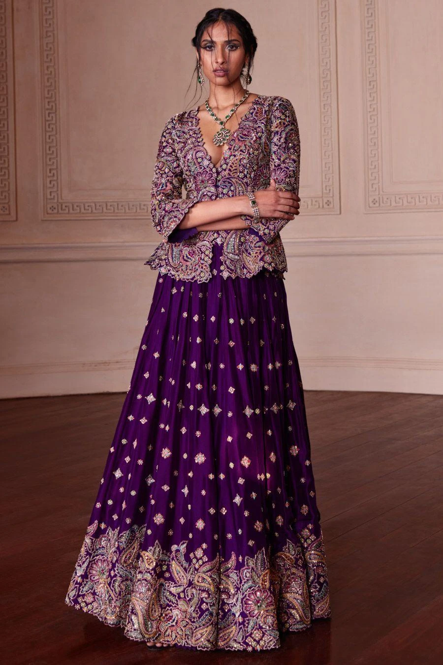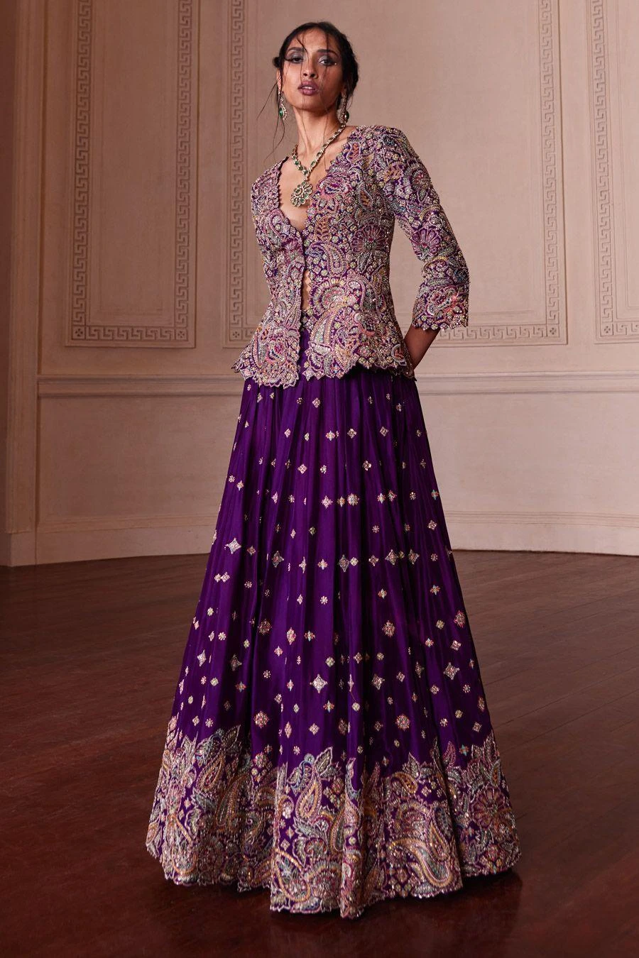 Bridal wear just got better & bigger with this grandiose lehenga. It is set in luxurious silk with handcrafted flowers fused with the charm of zardozi paired with a jacketed top paired with a lehenga & dupatta.