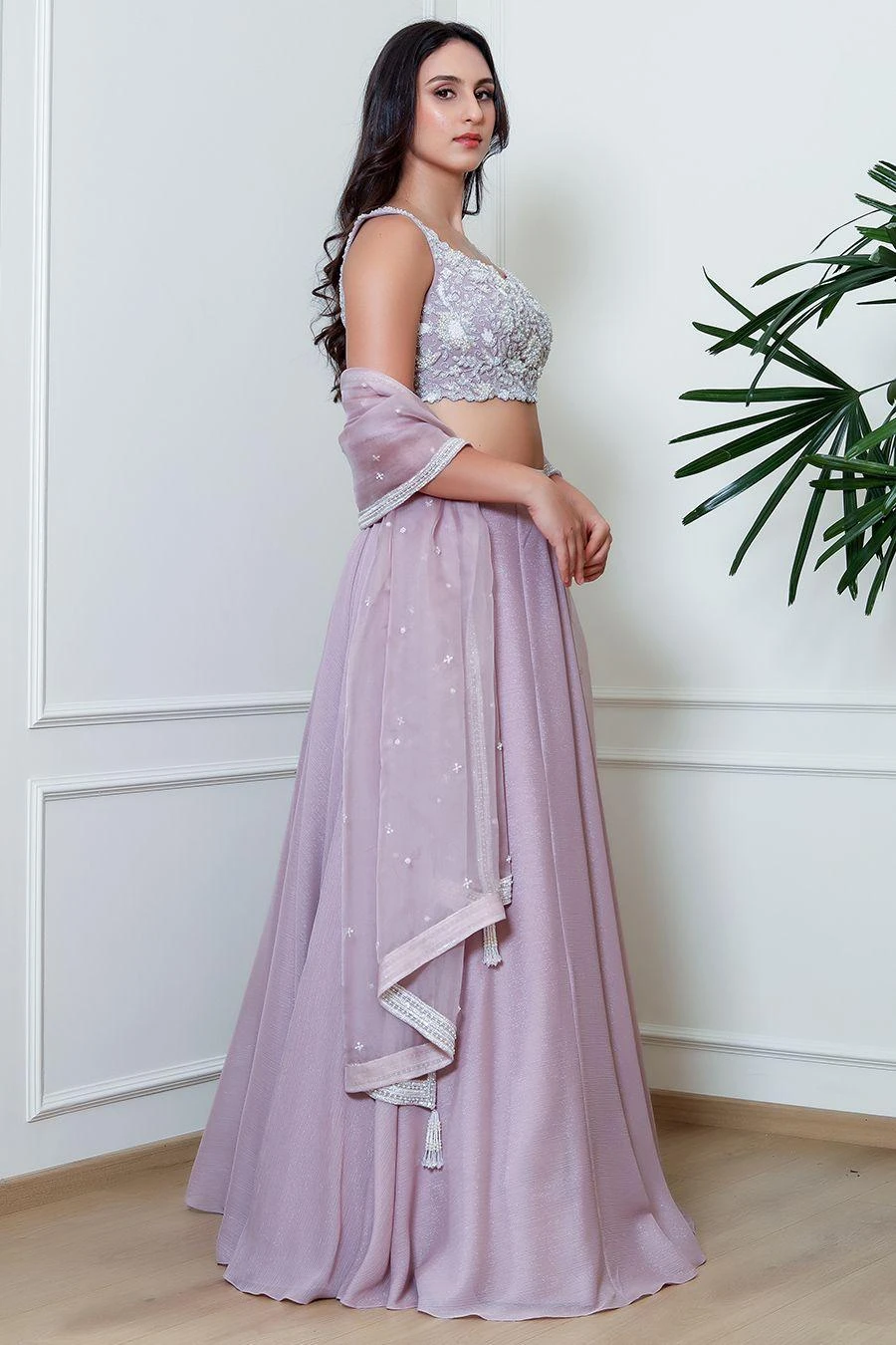 This lavender lehenga is meticulously crafted to elevate your ethnic game. The delicate hand embroidery on the blouse and dupatta exudes an ethereal charm, while the soft and silky fabric of the lehenga ensures utmost comfort.