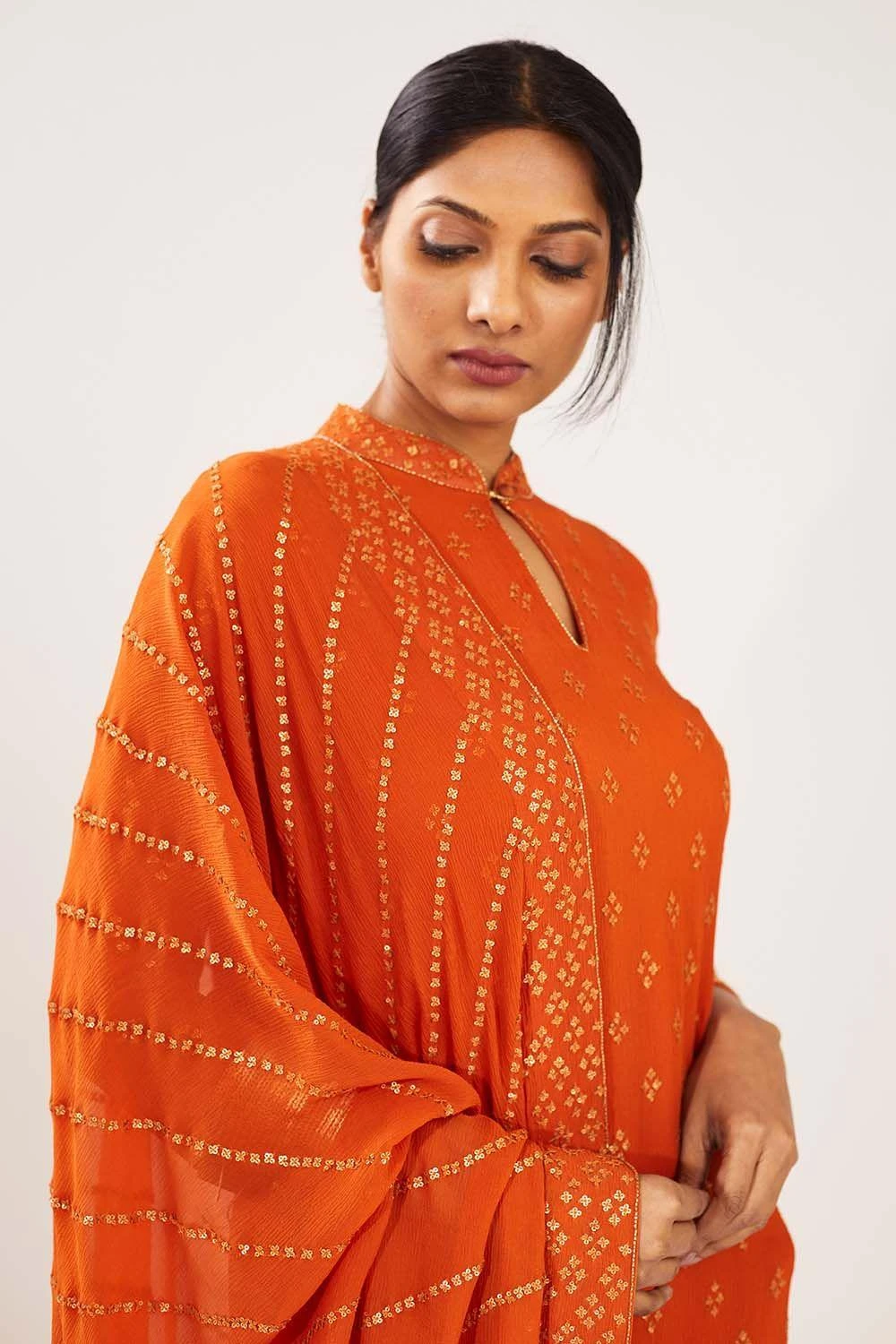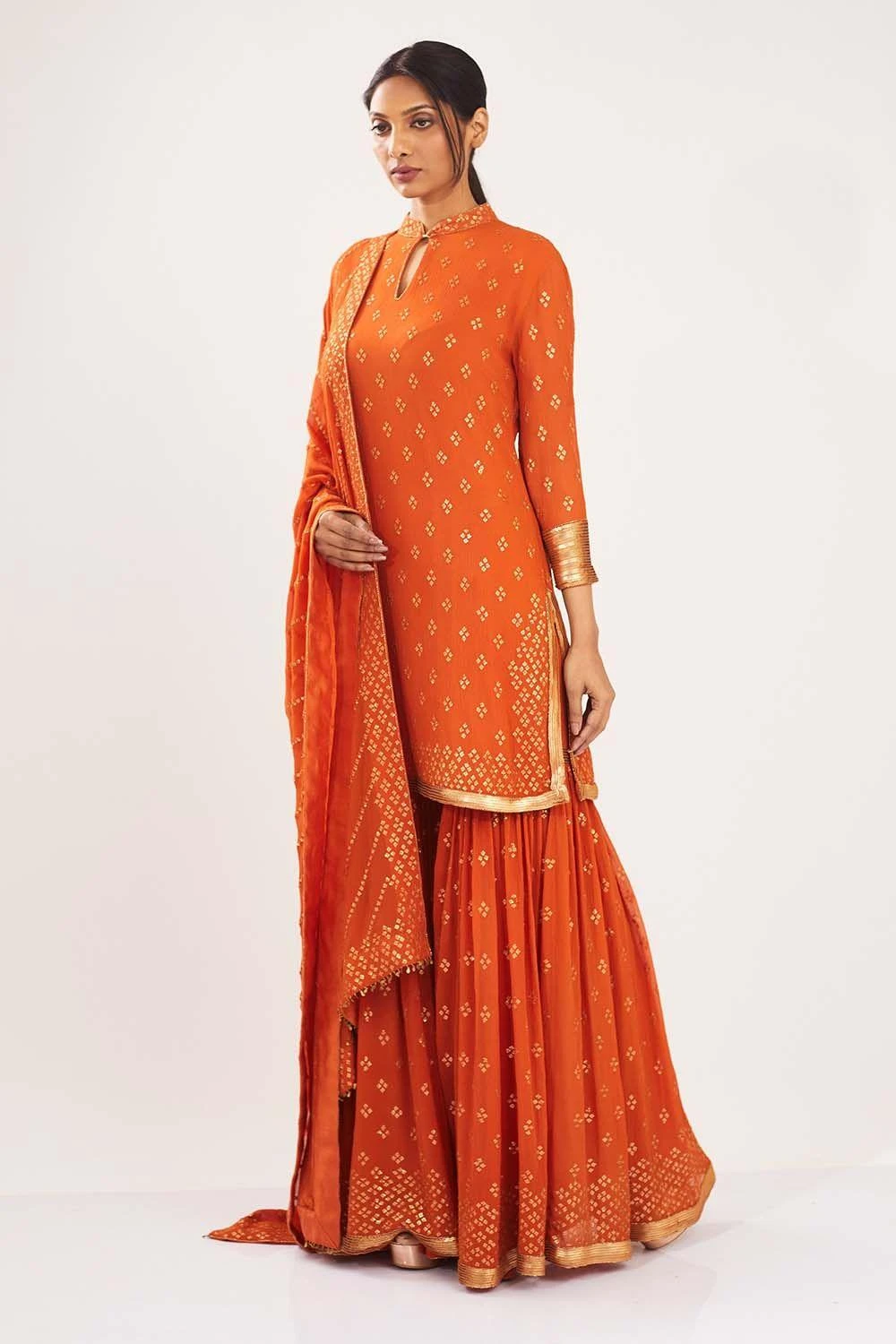 This orange bandhej sequin embroidered kurta and sharara paired with a lehriya sequin dupatta is a combination of elegance and glamour. This is a great choice to wear for mehendi functions & other wedding festivities.