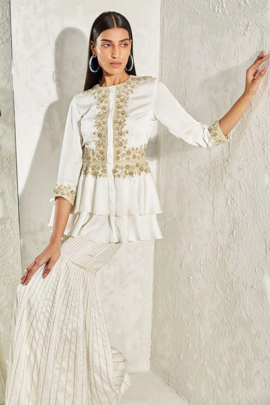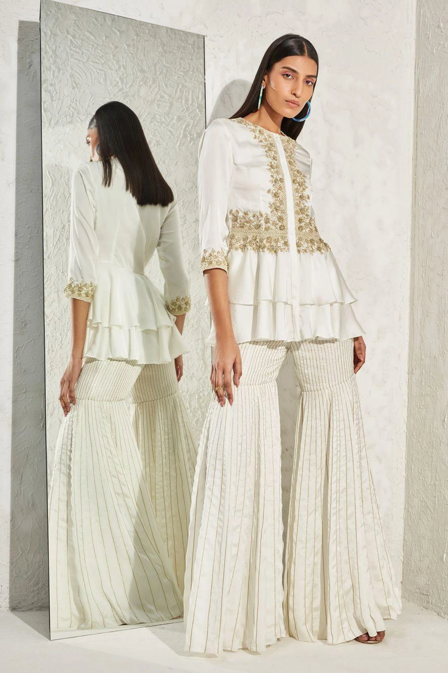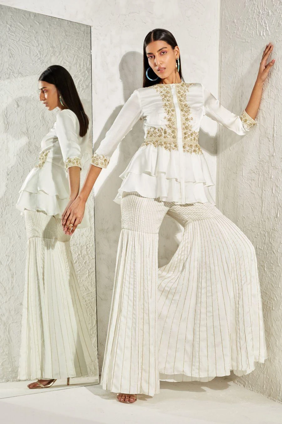 Look effortlessly stylish with this ivory coordinate set. Crafted in satin, this set features a floral geometric embellished peplum top paired with coordinating sharara pants. Add a pair of statement earrings to complete the look.