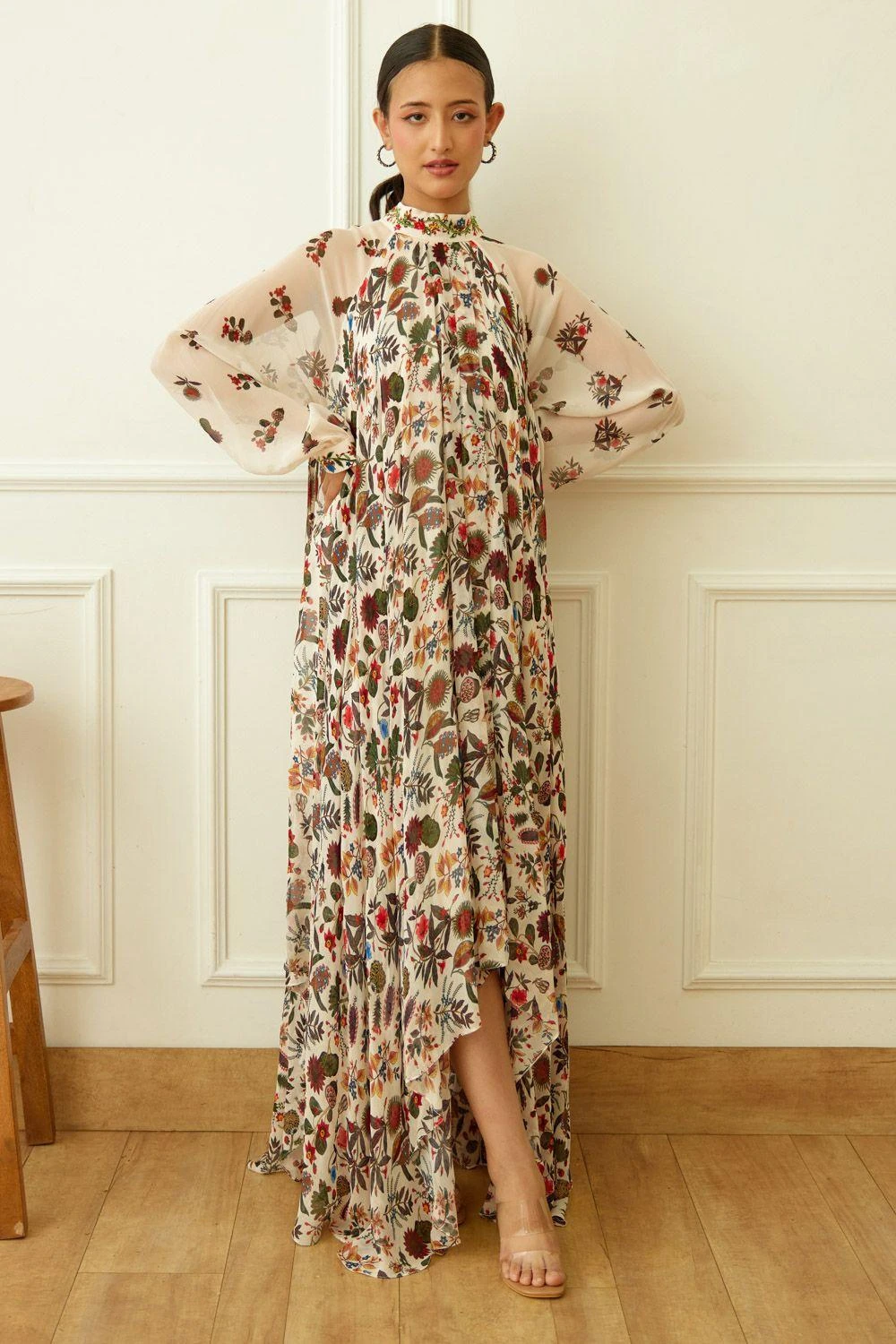 Step into elegance with this ivory kohinoor jaal print viscose georgette asymmetrical dress. Adorned with an embroidered bel collar tie, this piece embodies timeless charm and sophistication. Elevate your wardrobe with grace.