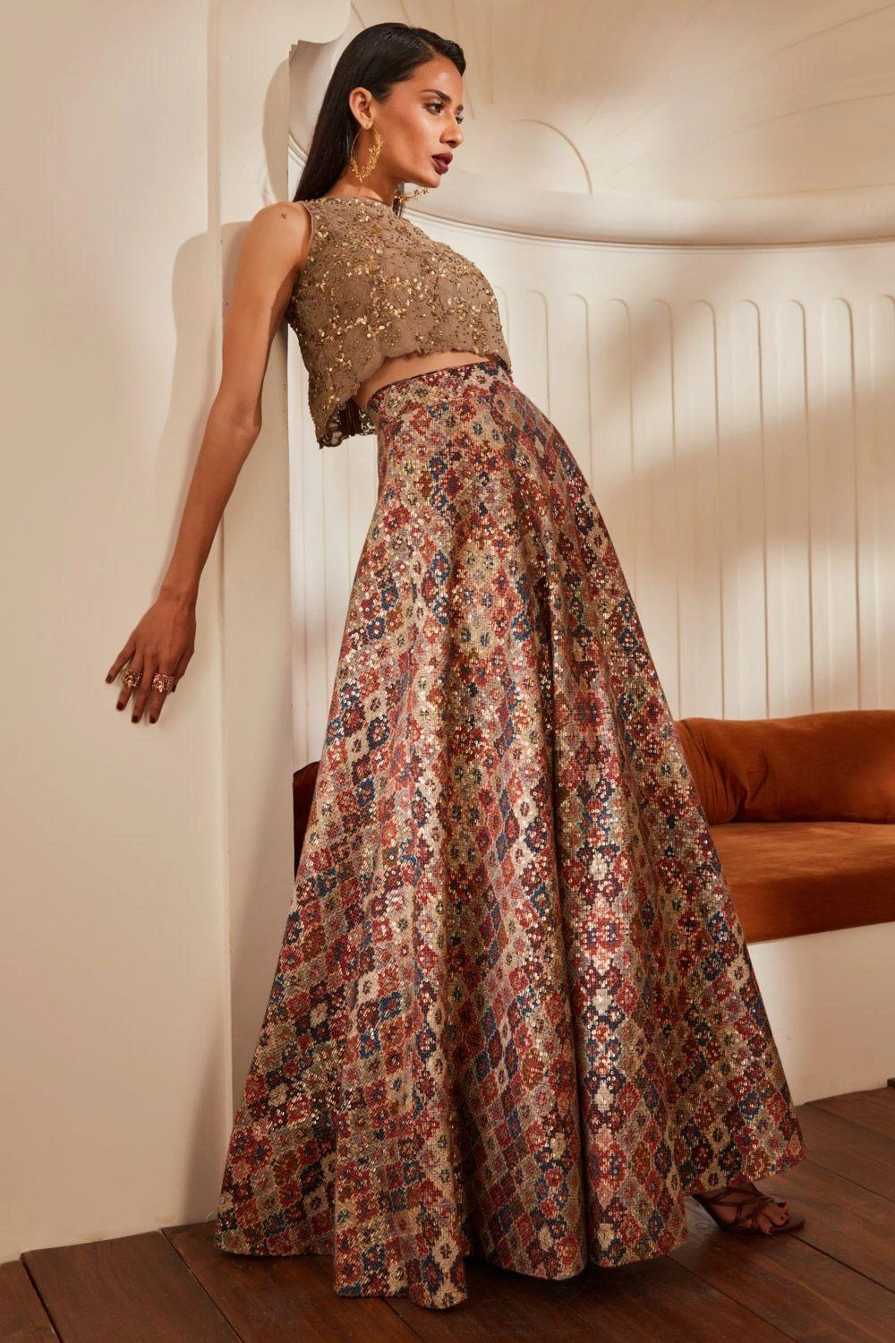 Ace your bridesmaid look in this one of a kind brick printed lehenga. It is engineered in sheeted pure georgette and paired with a baroque handwork tulle blouse and an organza dupatta. Add a studded hairband with this look.