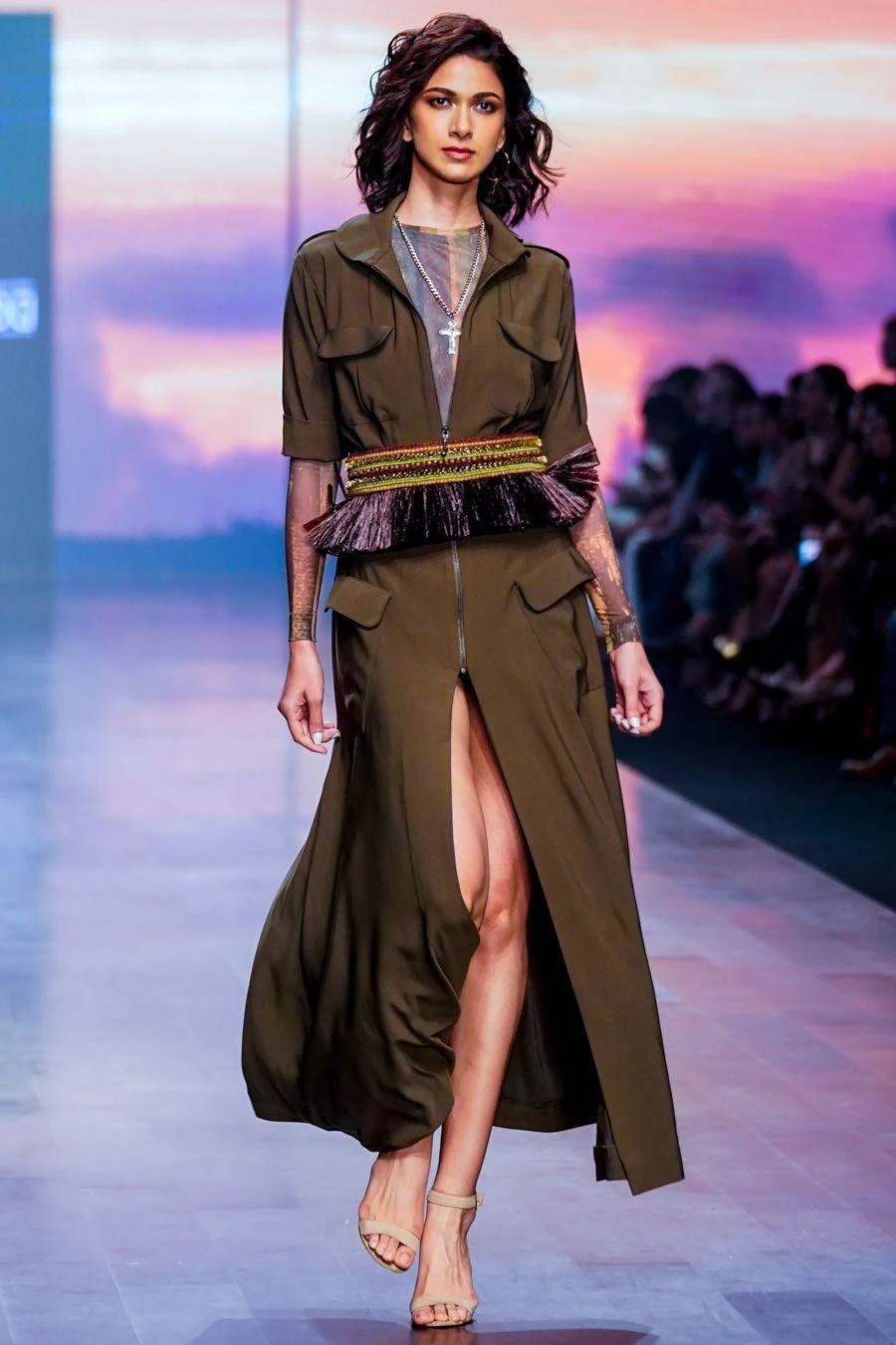 From dramatic Amazonian foliage to bold tribal-esque details, Nikita Mhaisalkar’s runway collection sings the song of the forest & all its life forms. This olive green shirt dress features patched pockets & a zipper closure at the front.