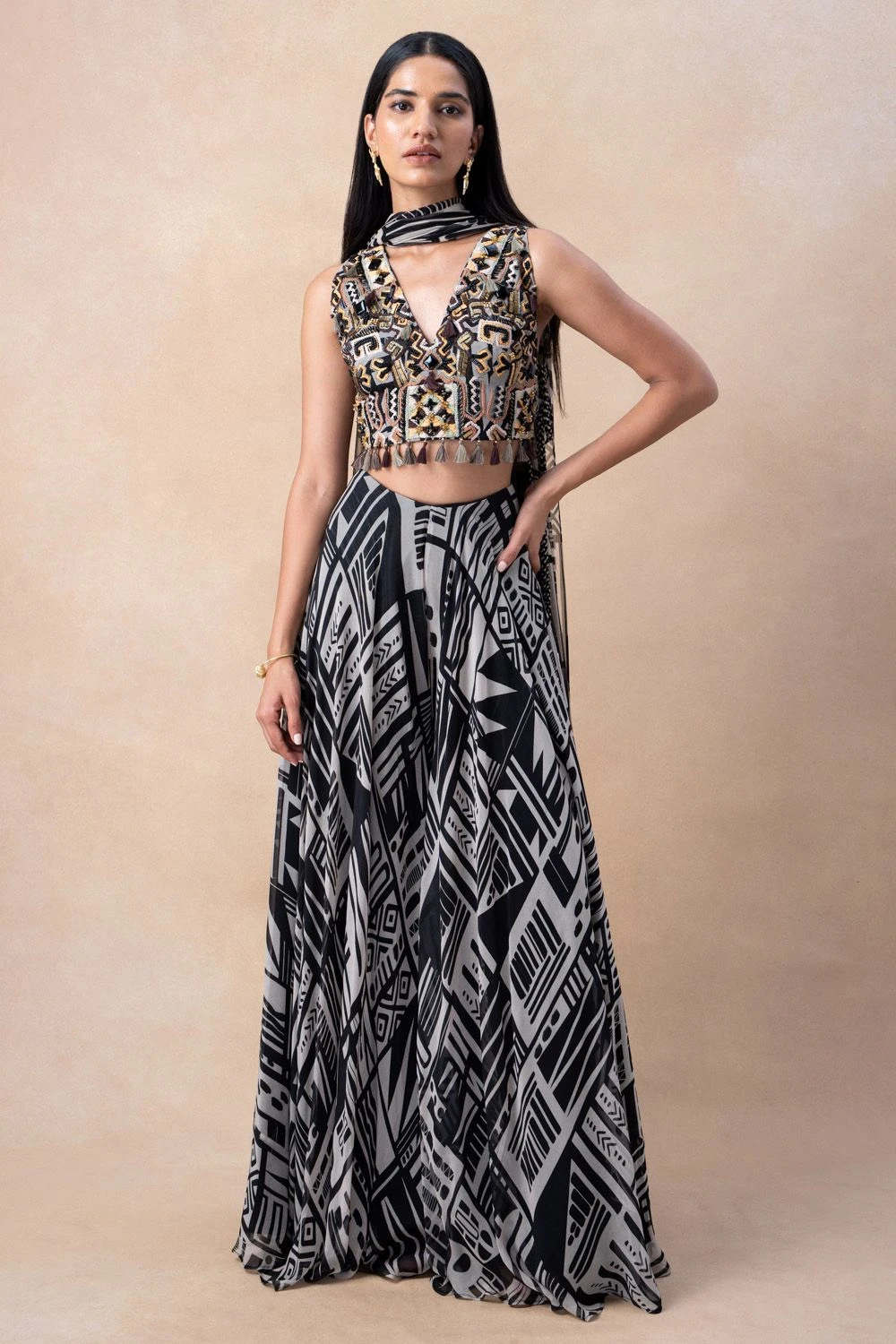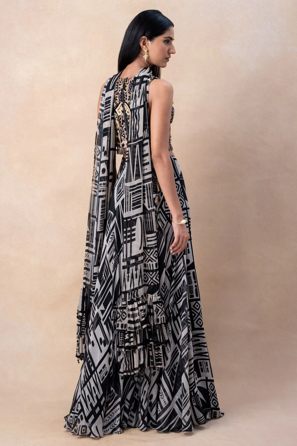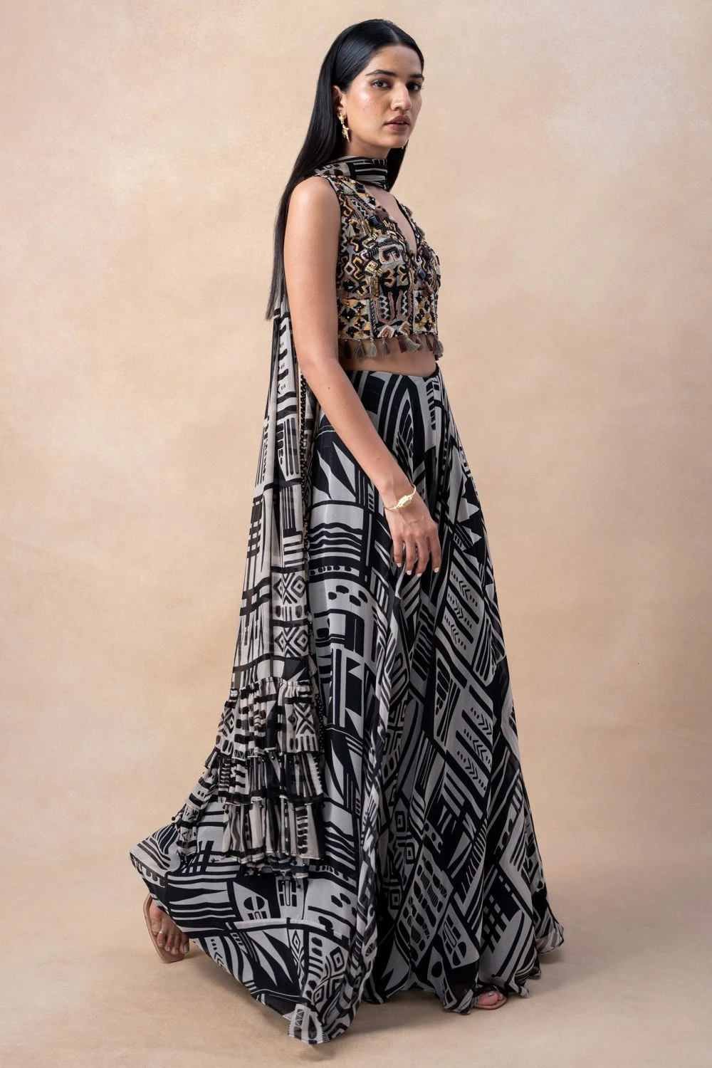 Step into the world of contemporary elegance with this White Abstract Printed Sharara Set. This exquisite ensemble features a stylish sharara adorned with an artistic abstract print in shades of white paired with an embellished blouse & a dupatta.
