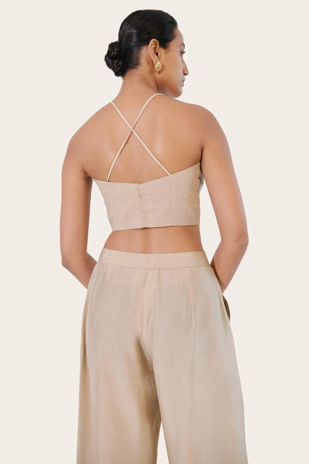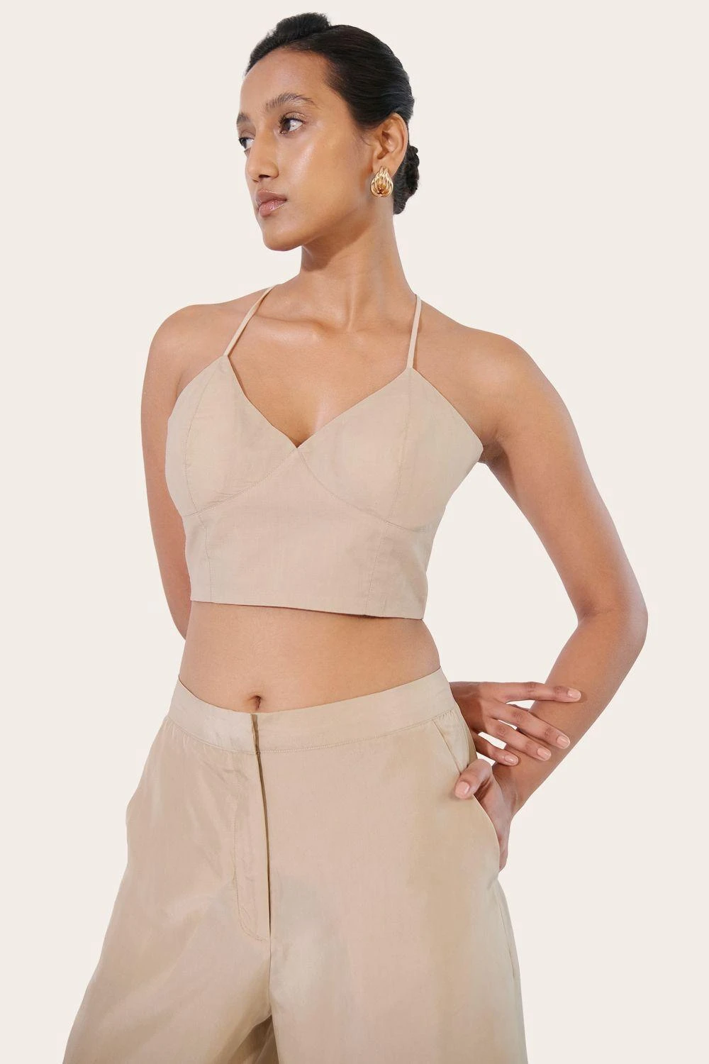 Crafted from breathable and lightweight cotton, this top exudes understated elegance with its clean lines. Its fitted, cropped design pairs perfectly with high-waisted pants, and we offer the matching pair for a complete ensemble.