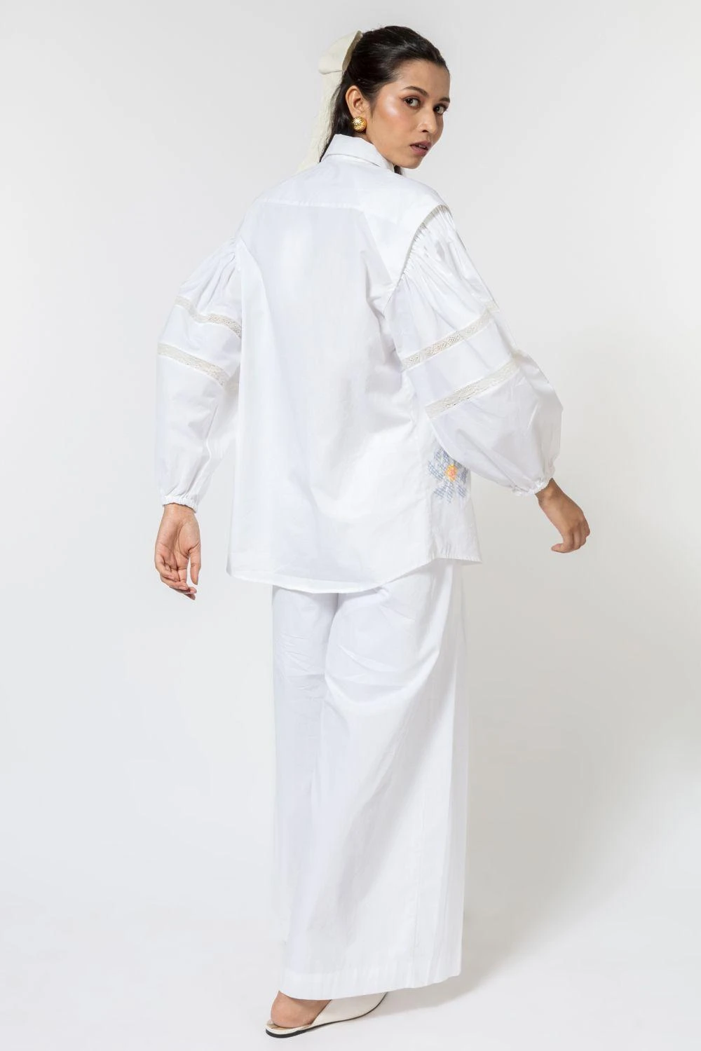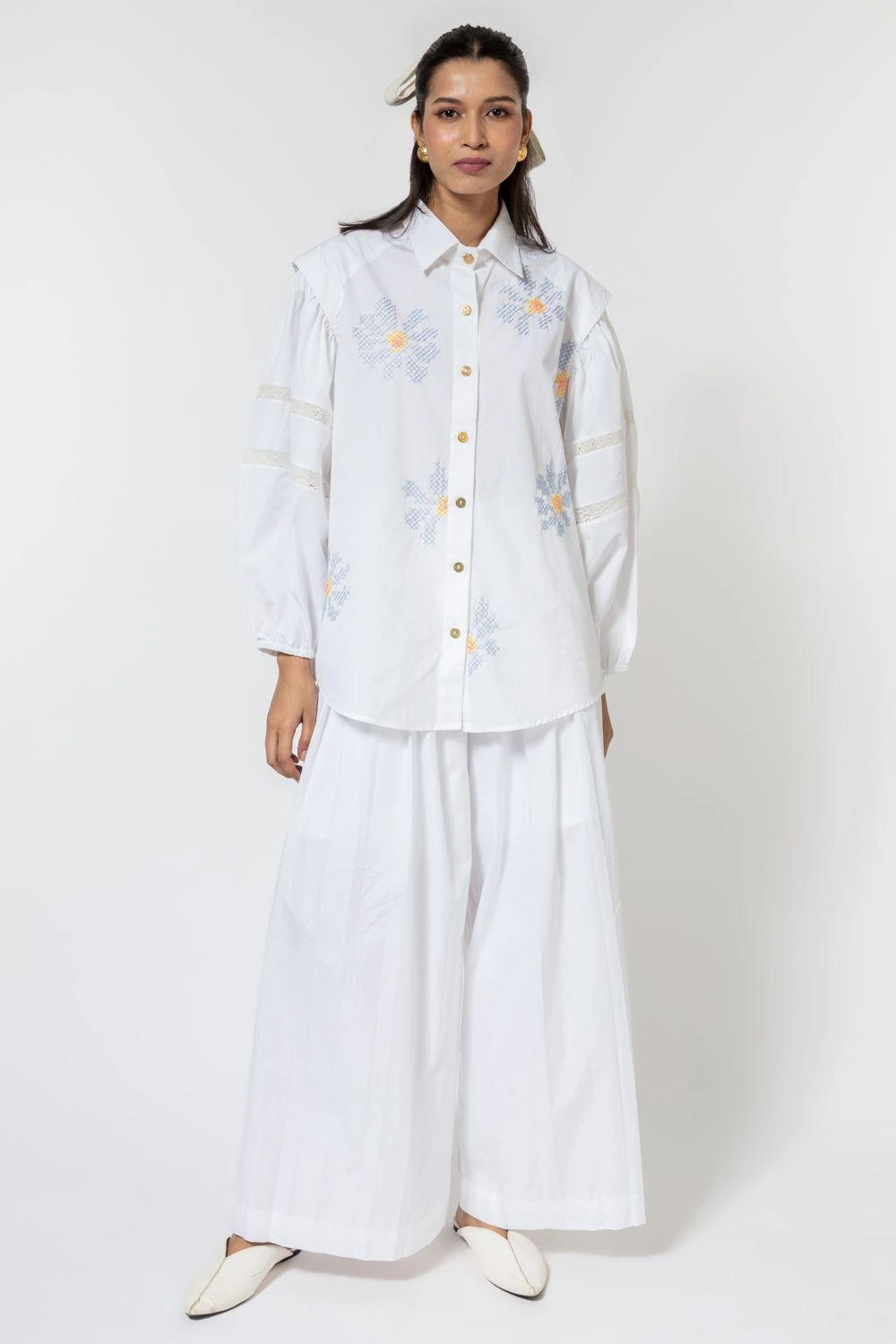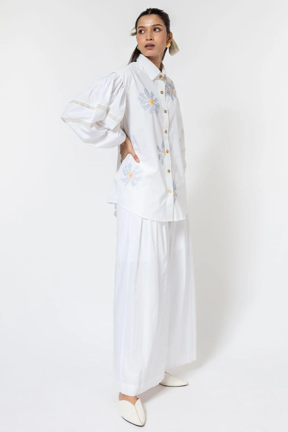March into spring with this white shirt for easy elegance & minimalism. It is cut in 100% cotton poplin with big puffed sleeves and features cross stitch embroidery in floral arrangement. You can style it with a denim skirt for a Sunday brunch.