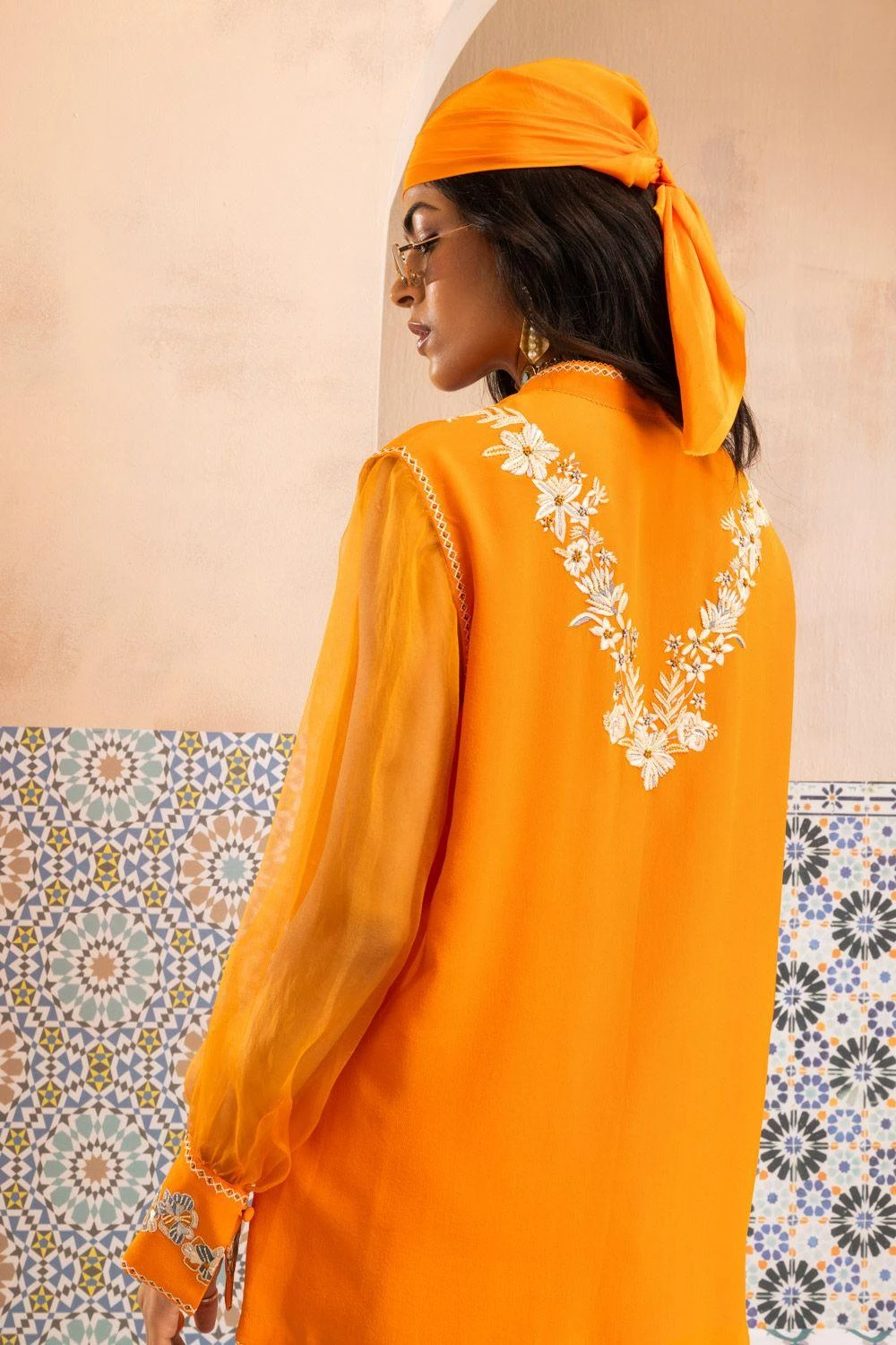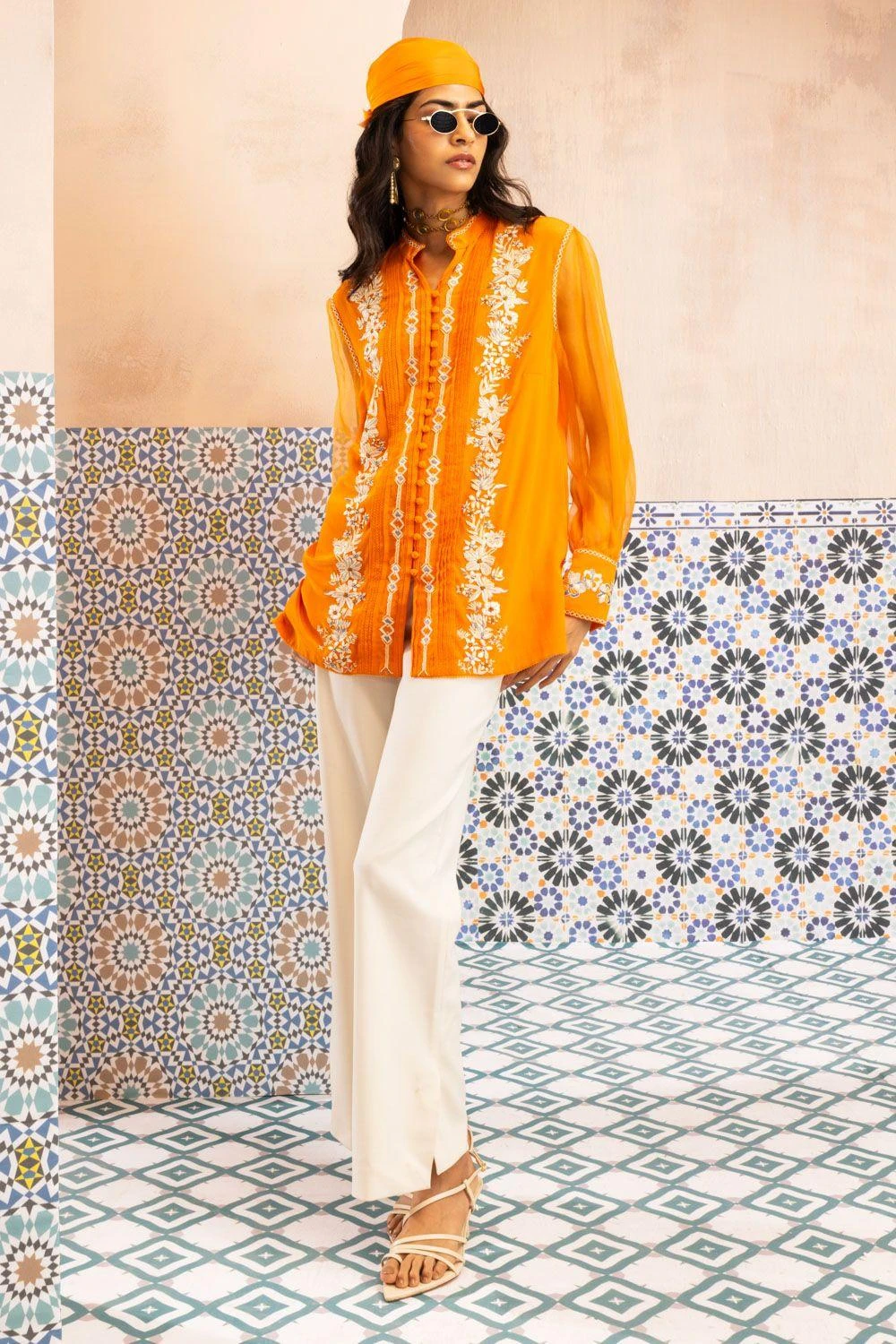 Look effortlessly stylish with this shirt. Crafted in silk crepe, this sunset orange shirt features Parsi gara embroidery with accents of ivory katdana & delicate techniques like French knots and bullion knots,