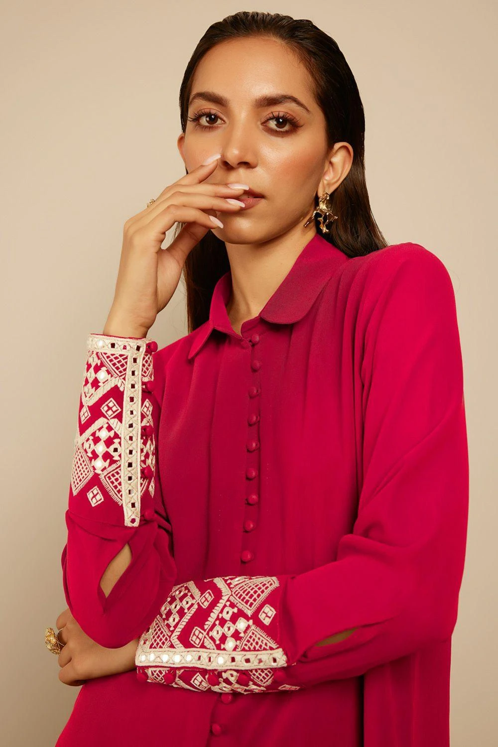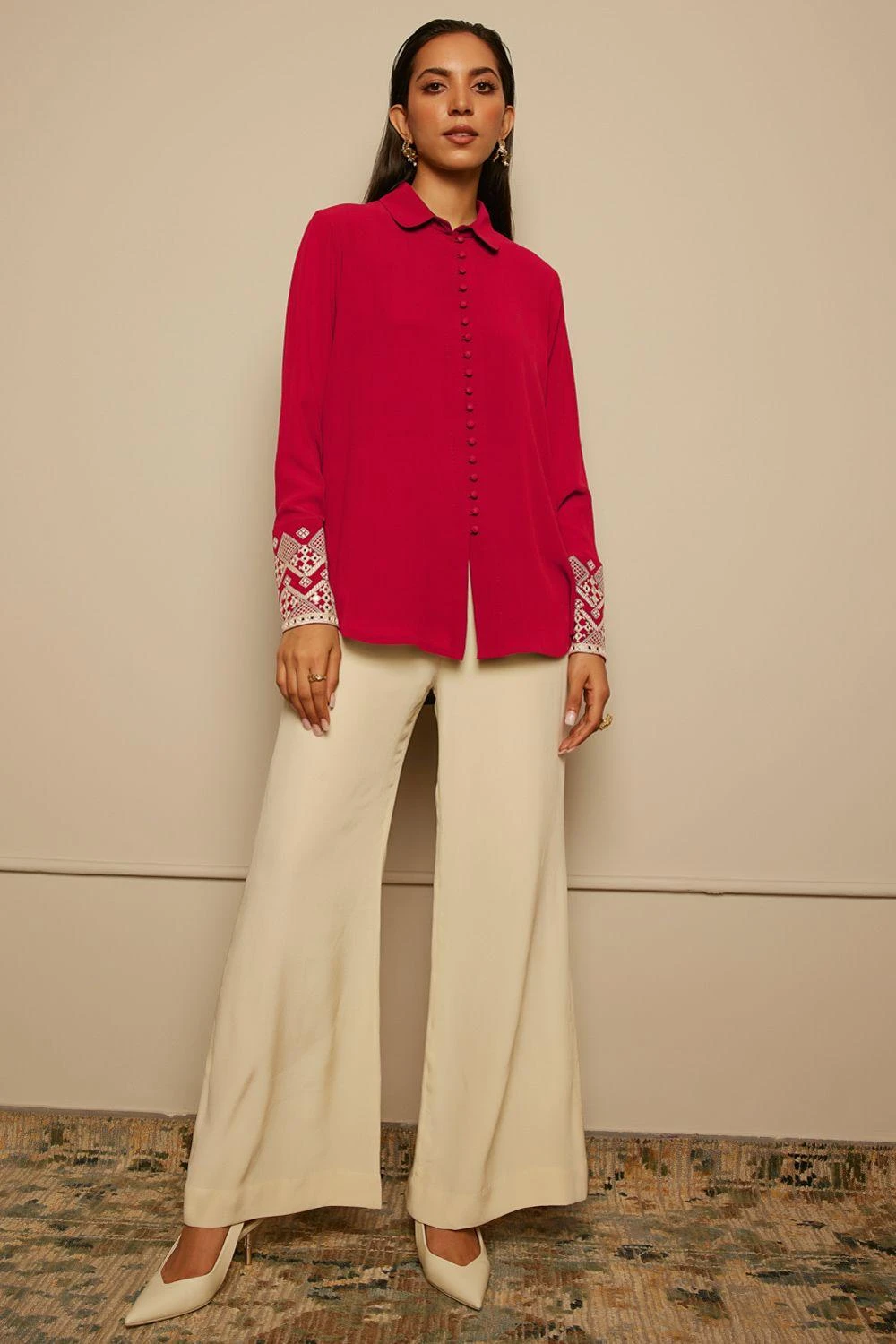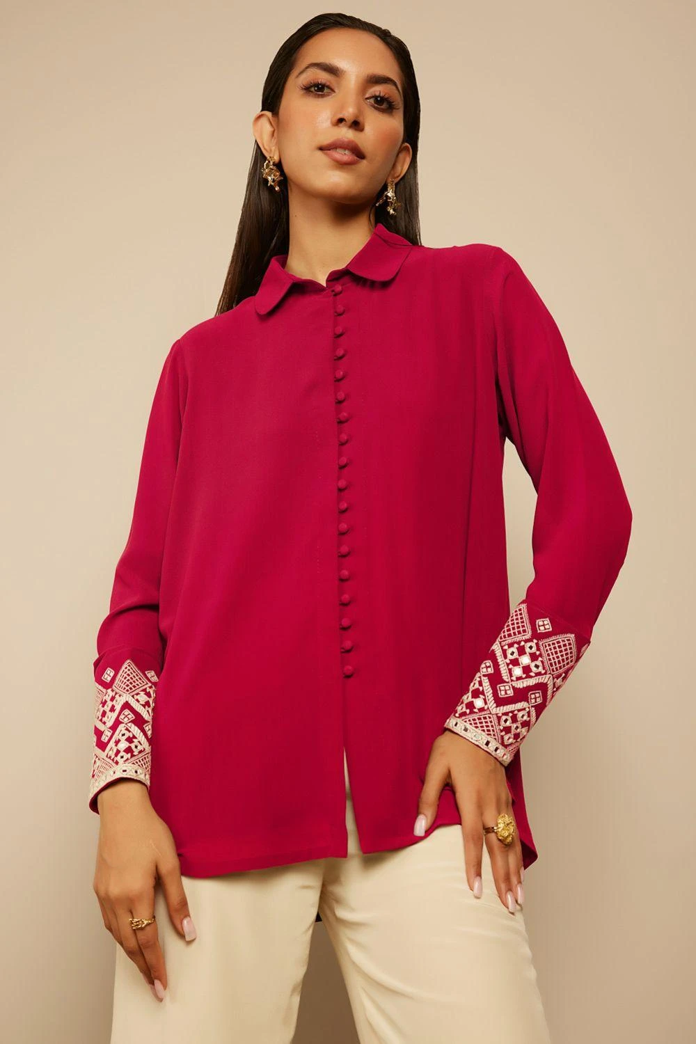 Despite its subtlety, this hot pink shirt ensures a high impact look. It is woven in sheen silk georgette and features intricate hand thread embroidery & mirror work on the cuffs. Style it with a pair of coordinating pants.